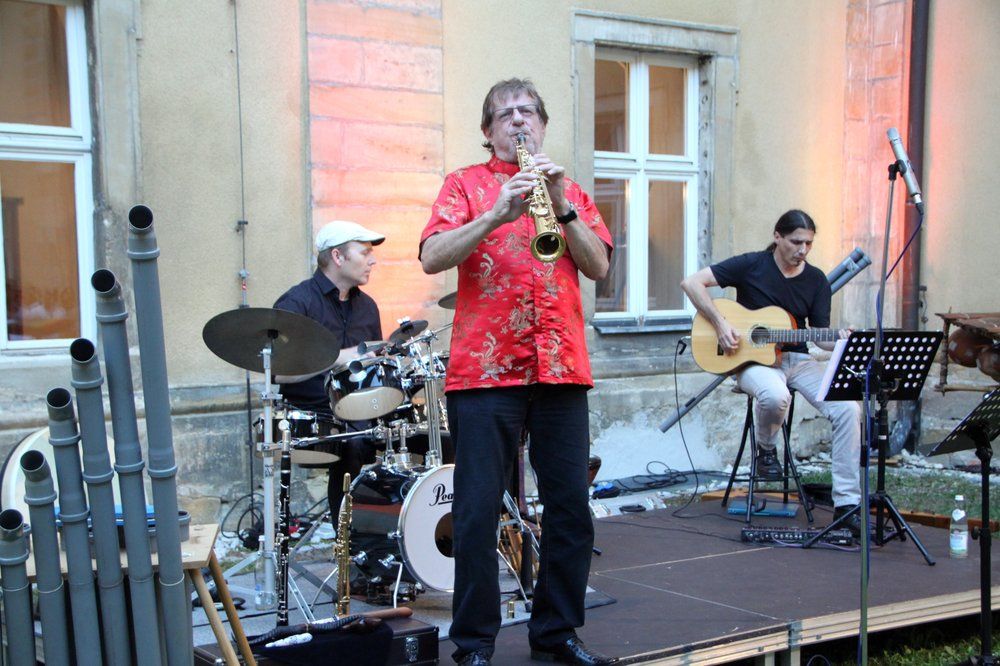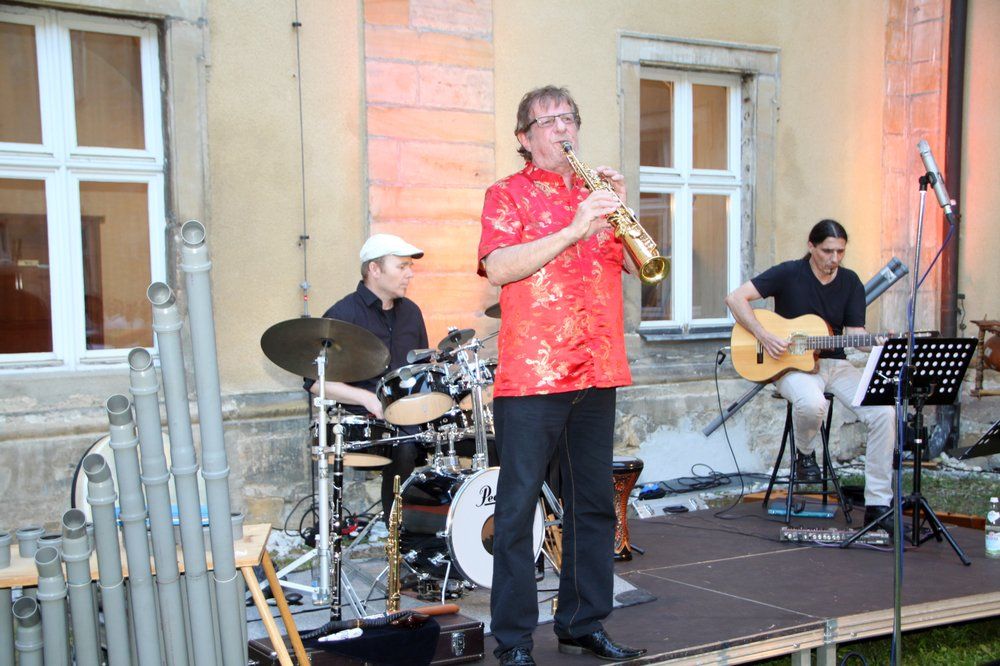 Gitarrist Peter Knoll spielte auch auf der „Obergeige“ Eigenkompositionen. Frank Wendeberg gab u. a. Soloeinlagen auf seinen Percussion-Instrumenten. Gleich zu Beginn überraschten der musikalische Allrounder Heinz Grobmeier und seine Mitstreiter mit einem alten Weibertanz aus dem bayerischen Raum von 1580, den sie in Eigeninterpretation spielten. Einfühlsam, dezent, virtuos und melancholisch – bei anderen Stücken mit fulminanten Klängen in fetzigem Sound - spielte Grobmeier Klarinette, Okarina, Saxophon, Springbock-Horn und andere Blasinstrumente.