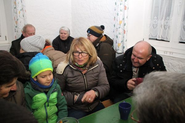 Derweil hatten draußen fleißige Mitarbeiter des Schnupfer-Clubs vor dem Eggenberghaus ein wärmendes Feuer angezündet, an dem sich die Gottesdienstbesucher äußerlich wärmen konnten. Zum „inneren Aufwärmen“ gab es heißen Glühwein und Stollen zur Stärkung, die auch im wohlig warm geheizten Eggenberghaus schmeckten, für den Abstieg aus den Höhen des Hirschwaldes. Anschließend begingen die Mitglieder des Schnupfer-Clubs im Vereinslokal Gasthaus Dietz bei saueren Bratwürstln den weltlichen Teil ihrer Weihnachtsfeier.