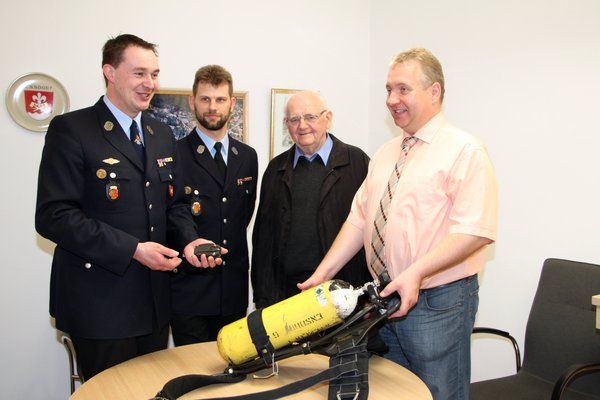 „Sie sind eine Rückversicherung für unsere Atemschutzgeräteträger, falls sie verunfallen sollten“, bezeichnete Atemschutzwart Martin Reiser die Geräte. Drei akustische und ein optisches Signal ermöglichen es, dass ein zweiter Atemschutztrupp die verunfallten Kameraden schneller finden und retten kann. „Dies ist äußerst wichtig, da der Atemluftvorrat in den Atemschutzgeräten nur maximal für eine halbe Stunde reicht“, hob Reiser hervor. Die sechs Liter Flaschen des Atemschutzgerätes stehen unter 300 Bar Druck und liefern 1800 Liter Atemluft. Die sind bei anstrengendem Einsatz bald verbraucht.