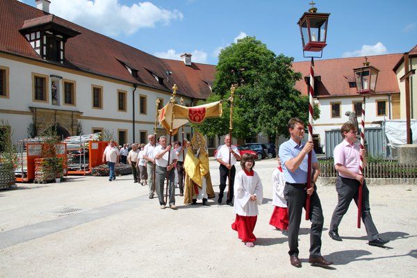 Die Bruderschaftsprozession mit Kreuz, Bruderschaftsfahne und dem Bruderschaftsrat voraus und Pfarrer Sturm mit dem Allerheiligsten in der Monstranz sowie den Gläubige um den Ortskern als Bekenntnis zum Allerheiligsten Altarsakrament fand heuer bei strahlendem Sonnenschein statt. Zum Abschluss erklang im Klosterinnenhof vielstimmig das „Tantum ergo“ und „Großer Gott, wir loben dich“.