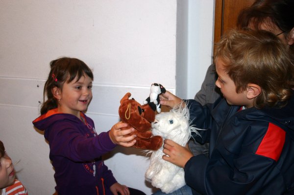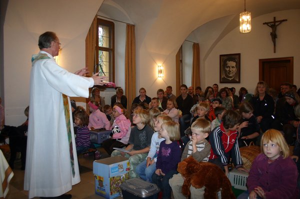 Hunde bellten beim Kindergottesdienst, Kätzchen miauten, Vögel zwitscherten dezent. Häschen, Hamster, Meerschweinchen, Schildkröten und ein Huhn verhielten sich ganz still, von den vielen netten und lustigen Kuscheltieren ganz zu schweigen. „Franziskus war ein Herr des Friedens, er liebte das Leben und die Umwelt, war immer ein Freund der Tiere, man erzählt sogar, dass er mit ihnen gesprochen hat“, betonte der Pfarrer. Er habe zu ihnen gesagt: „Ihr seid meine Brüder und Schwestern, Bruder Esel, Schwester Katze, Bruder Hund und Schwester Fliege“. Pfarrer Sturm: „Er predigte von der Liebe Gottes. Seiner Liebe zu den Menschen, aber auch zu den Tieren und der ganzen Schöpfung. Alles was Gott geschaffen hat ist wunderbar. Wir müssen die Schöpfung ehren und dürfen sie nicht kaputt machen“ Dann wurde gemeinsam gebetet: „Großer Gott, du hast alle Tiere geschaffen, die Fische im Wasser, die Vögel in der Luft, die Tiere auf der Erde. Sie springen und singen und loben Dich. Wie wunderbar ist alles, was du geschaffen hast. Wir danken Dir dafür.“ Eltern und Kinder sangen gemeinsam „Gott hält die ganze Welt in seiner Hand“. Danach brachte der Geistliche den Kindern das Leben des hl. Franziskus näher, der die ganze Schöpfung, Sonne, Mond und Sterne, die Menschen, Pflanzen und vor allem die Tiere geliebt und mit ihnen gesprochen hat. Die Kinder stellten ihre Tiere und Kuscheltiere vor.
