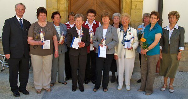 Ehrenurkunde und die Frauenbundkerze als Präsent überreichte die Vorsitzende zusammen mit Pfarrer Sturm für 25-jährige Mitgliedschaft an Barbara Scharl. Für 30 Jahre Treue zum Frauenbund wurden Elfriede Gropp, Anna Reindl, Anneliese Rothut, Dorothea Scharl, Barbara Schmid, Sperl Theresia und Anna Spitzl ausgezeichnet. An Vorsitzende Erika Fröhlich überreichte Pfarrer Sturm „ein kleines erbauliches Büchlein für all ihre Mühen“. Mitgliedsnadel und Bundesgebet übergab diese an die Neumitglieder Edith Eichenseer und Marianne Renner als Zeichen ihrer Mitgliedschaft zum Katholischen Deutschen Frauenbund.