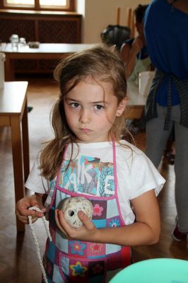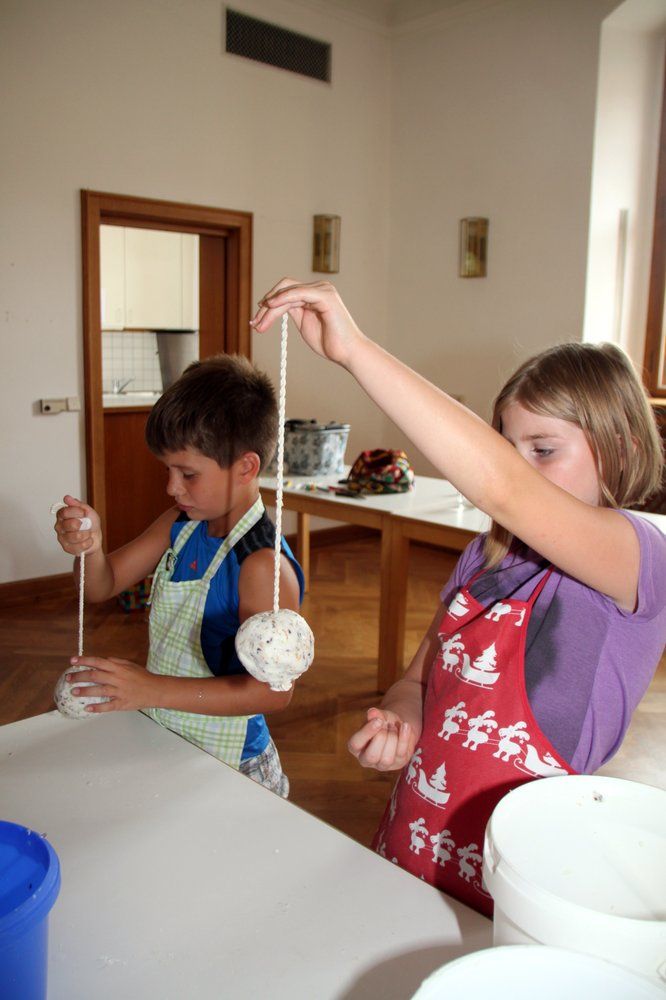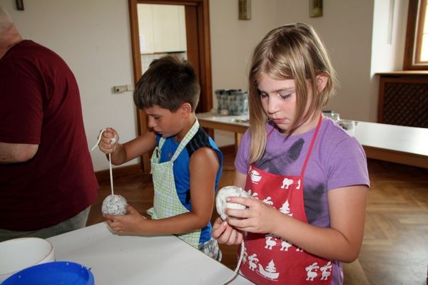 Zunächst galt es die Seife in Flocken zu reiben und diese in eine Schüssel zu geben. Dann wurden die Blüten hinzugefügt und teelöffelweise Wasser dazugegeben bis beim Mischen ein fester Brei entstand. „Gar nicht so einfach! Stellten die Kinder fest. Der Seifenbrei wurde dann mit den Händen zu einem Ballgeformt, mit dem Stiel eines Holzlöffels wurde dann ein Loch in die Kugel gebohrt, um später das gedrehte und gezwirbelte Seil einfädeln zu können. Als schließlich der Seifenball vollständig getrocknet war, konnten die Kids das Seilstück unter dem Seifenball verknoten und es dann Zuhause im Badezimmer aufhängen.