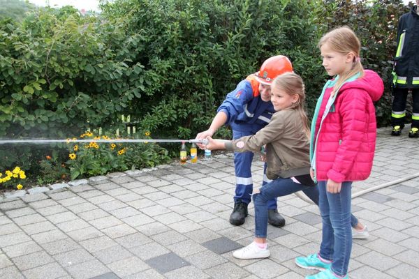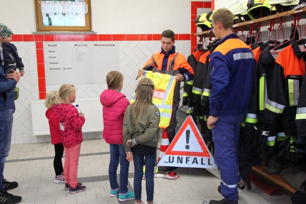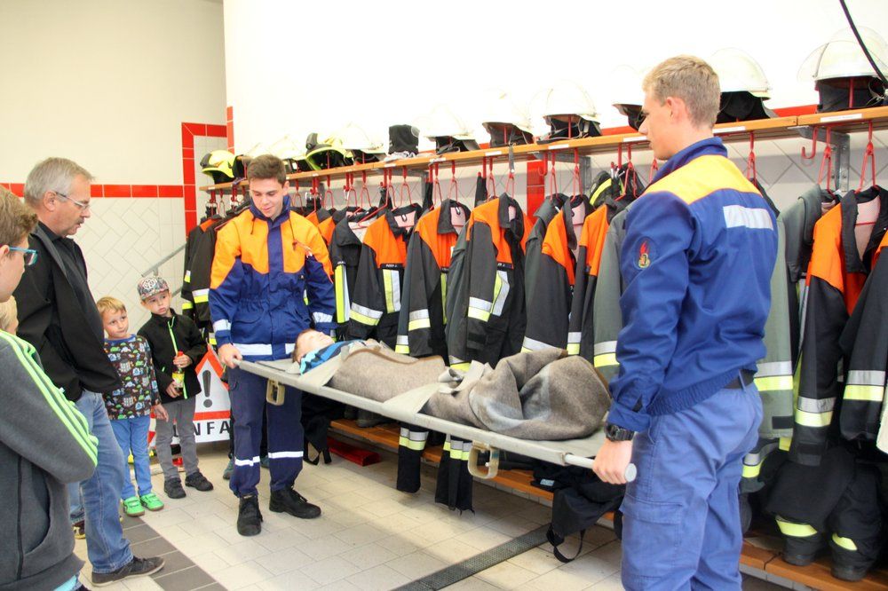 Im Feuerwehrgerätehaus waren Geräte aufgebaut. Auf der Krankentrage durfte sie „Platz nehmen“ und wurden „gerettet“, mit Hilfe des Rettungsrucksacks „verarztet“. Erläutert wurde ihnen die Verkehrswarneinrichtungen der Feuerwehr, Spezialschutzausrüstungen der Feuerwehr wie Imkeranzug, Wathose, Hitzeschutzanzug, des weiteren Motorsägen und Schnittschutzhosen gezeigt, sie über Löschaufbau mit Verteiler und Strahlrohr aufgeklärt.