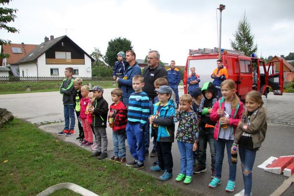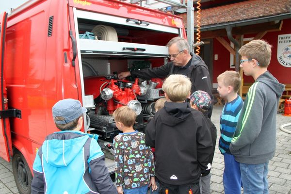 Am Tragkraftspritzenfahrzeug (TSF) der Wolfsbacher Wehr sahen die Buben und Mädchen die weiteren zur Brandbekämpfung aber auch Lebensrettung notwendigen Geräte. „Ganz cool“ fanden sie, dass sie sich auch in das Feuerwehrzeug setzen durften und „Tatü-Tata“ Blaulicht und Martinshorn einschalten durften.