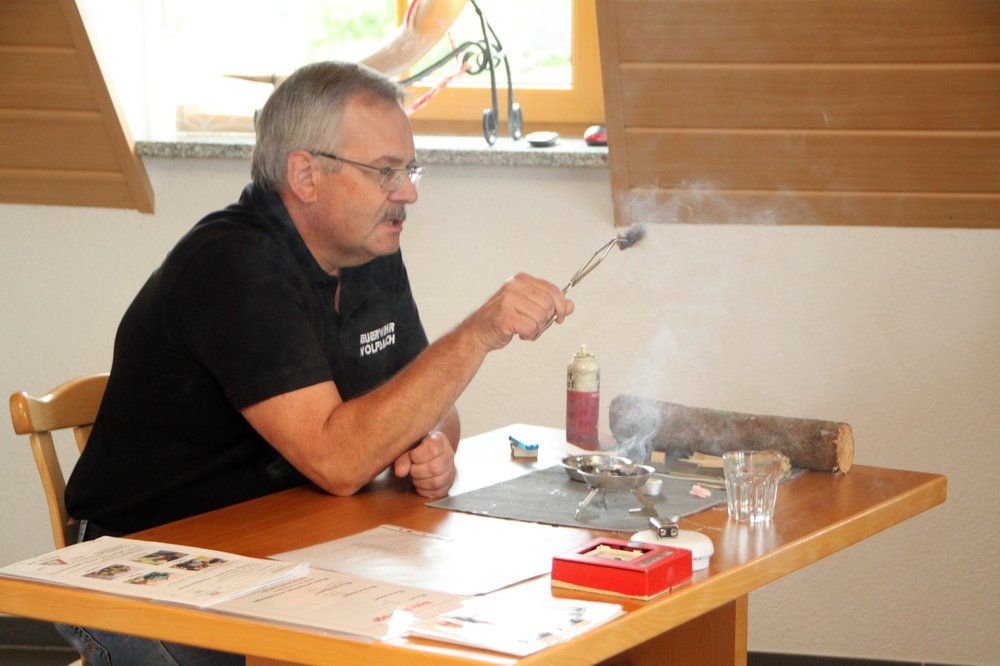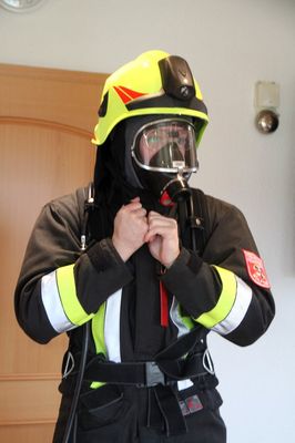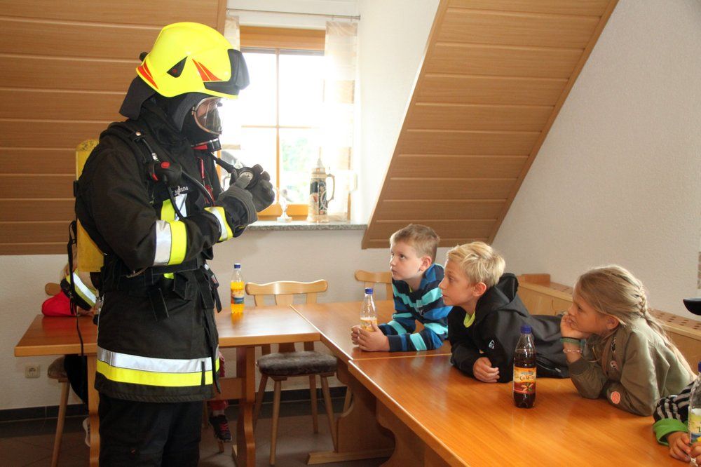 Sie erfuhren vom Kommandanten die Notwendigkeit von Feuer- und Rauchwarnmeldern, wie man einen Notruf an die Notrufnummer 112 richtig absetzt. Jugendwart Julian Pusch zeigte ihnen die Schutzausrüstung der Feuerwehrleute und die Atemschutzausrüstung, betonte, dass sie vor diesen „Marsmenschen“ im Ernstfall keine Angst haben müssen und sich nicht verstecken dürfen, sich vielmehr melden müssen. Die Kinder durften auch Fluchthauben aufsetzen. „Die können euer Leben retten!“ erklärte er. Außerdem wurde den Kindern ein Videofilm über Brandbekämpfung gezeigt.