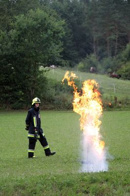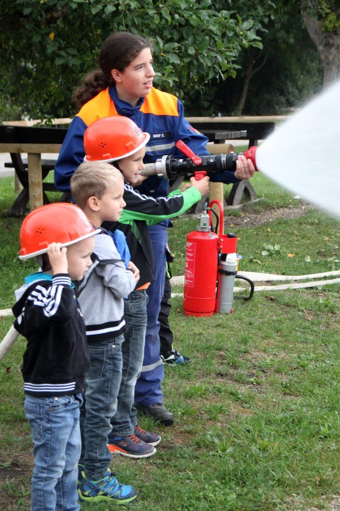 Dann aber ging es ins Freie, und sogleich enterten die Kids das Feuerwehrauto TSF (Tragkraftspritzenfahrzeug). Sie wurden durch stellvertretenden Kommandanten Dominik Ernst und Jugendwart Julian Pusch den Jungfeuerwehrlern David Ernst, Jugendsprecher Daniel Fröhlich, Sophie Graf, Benedikt Pusch, Alexandra Schindler, Elias Schönfelder und Louis Übeler als Helfer zugeteilt. Gleich ging es für die Kinder auf dem Festplatz ans Eingemachte: Stellvertretender Dominik Ernst und stellvertretender Jugendwart Philipp Wiesner demonstrierten realistisch in einer Fettbrandsimulation in einem Topf, „dass ein Fettbrand auf keinen Fall mit Wasser gelöscht werden darf“. Eine Decke oder Sand sind dagegen sinnvoll. Eine riesige Stichflamme überzeugte die Kids.