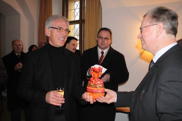 Beim anschließenden Stehempfang im Pfarrsaal bedankte sich Pfarrer Sturm bei den Musikern für die Gestaltung des Festgottesdienstes „mit meiner liebsten Messe“ und allen kirchlichen Mitarbeitern und Helfern der Pfarrei für ihren Einsatz. Chorleiter Gerhard Tschaffon bedachte er neben einem herzlichen Vergelt’s Gott mit einem Orgelkalender.