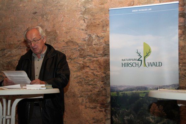 Überrascht wurden die Besucher dadurch, dass er verkündete, dass nichts aus diesem Sonderband gelesen werde, sondern andere Geschichten aus dieser Region, die anregen und interessieren sollen, den Band zu kaufen und zu lesen. Naturparkvorsitzender Bürgermeister Markus Dollacker aus Ensdorf erklärte, dass für diese Vorstellung das Torhaus Hirschwald wohl der richtige Ort und zugleich eine Werbung für den Naturpark sei. Isabel Lautenschlager, Geschäftsführerin des Naturpark Hirschwald, der nunmehr seit zehn Jahren besteht, betonte, dass dieser knapp 28000 Hektar umfasst neben der kreisfreien Stadt Amberg und den Gemeinden Kümmersbruck, Ensdorf und Ursensollen auch die Marktgemeinden Rieden, Schmidmühlen, Hohenburg und Kastl umfasst. Als Träger des Naturpark Hirschwald fungiere der Naturpark Hirschwald e. V., dem neben diesen Gemeinden der Landkreis Amberg-Sulzbach, die Gemeinde Ebermannsdorf ist angeschlossen ist. „Die vier Hauptaufgaben sind die Pflege der Arten- und Biotopvielfalt, nachhaltiger Tourismus, nachhaltige Regionalentwicklung und Umweltbildung.“ In der Satzung heißt es dazu u.a, Der Verein hat hierzu insbesondere die Aufgabe, bei der Erschließung der landschaftlichen Schönheiten, der Bauten und Kulturstätten dieses Gebietes für Zwecke der Erholung „und zur Pflege der Heimatliebe und Heimatkunde mitzuwirken“.