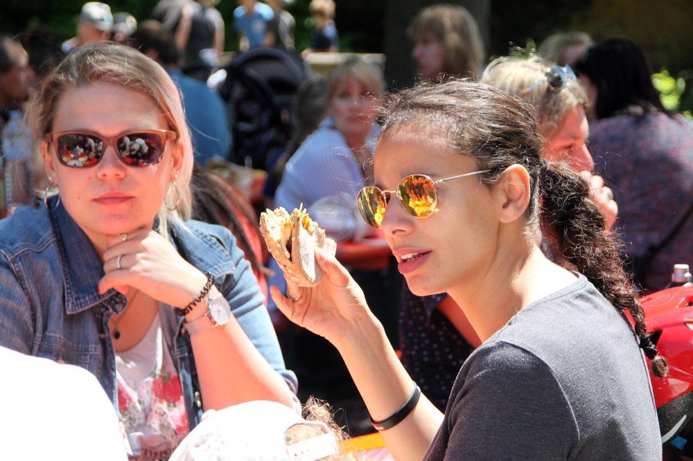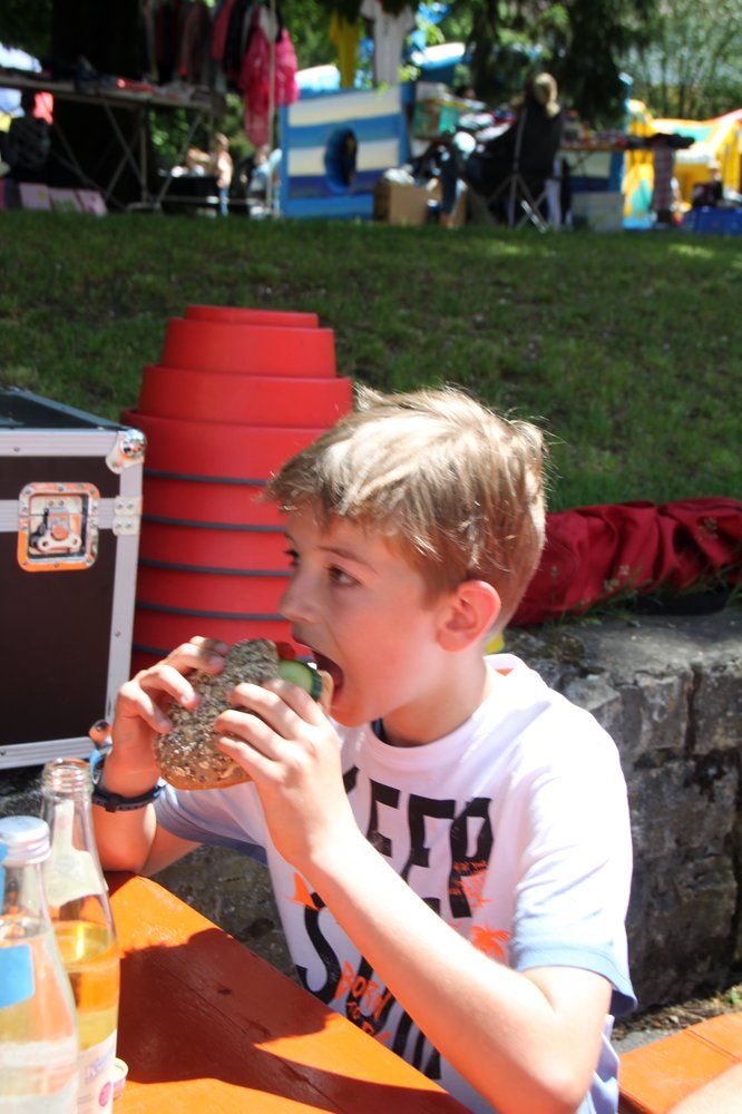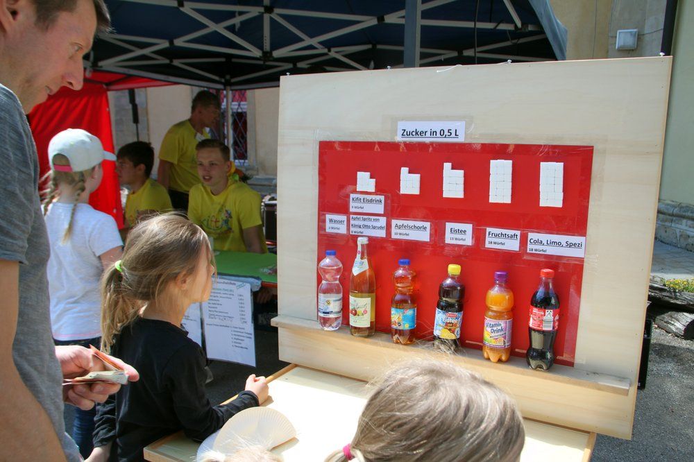 Bei sonnigem vorsommerlichem Wetter kamen Hunderte Kinder mit ihren Vätern und Müttern in den Klosterpark und hatten ab 11 Uhr einen spannenden, vergnüglichen und alternativen Tag, geprägt von viel Spaß, Spiel und Unterhaltung sowie gesunder Ernährung unter dem Motto: „Frei von Zucker und Fettbomben“. Und so bot die Klosterküche aus regionaler Küche Vollkornburger Chicken- oder Veggie, Backofen-Pommes ohne Fett mit Karotten, Pastinaken und Dip oder Kichererbsen-Gemüse-Curry und Couscous-Salat sowie verschiedene knackige Obstsalate. Außerdem gab es leckere Brote mit Frischkäse- oder Obatzda-Aufstrich mit Gurken und Paprika oder Obstscheibenbelegt sowie bunte Fruchtspieße. Fruchtige Shakes und andere kühle Naturgetränke gab es als Durstlöscher, aber auch Kaffee, Kuchen und Torten. Die richtige Ernährung macht’s eben! Am Zucker-Infostand staunten viele, wie viel Zucker in verschiedenen Getränken enthalten sind. Die Mütter konnten sich über Neuheiten von „Tupperware“ informieren, zum Leidwesen so mancher Väter, die sich dafür mit Krackern mit leckerem Belag schadlos hielten. Der Hutzelhof war wie gewohnt mit Obst und Gemüse vertreten, erstmals auch mit Produkten aus der Demeter-Bäckerei. Beim Kräuterrätsel „Kennst du alle Kräuter hier?“ gab es eine Gemüsekiste zu gewinnen.