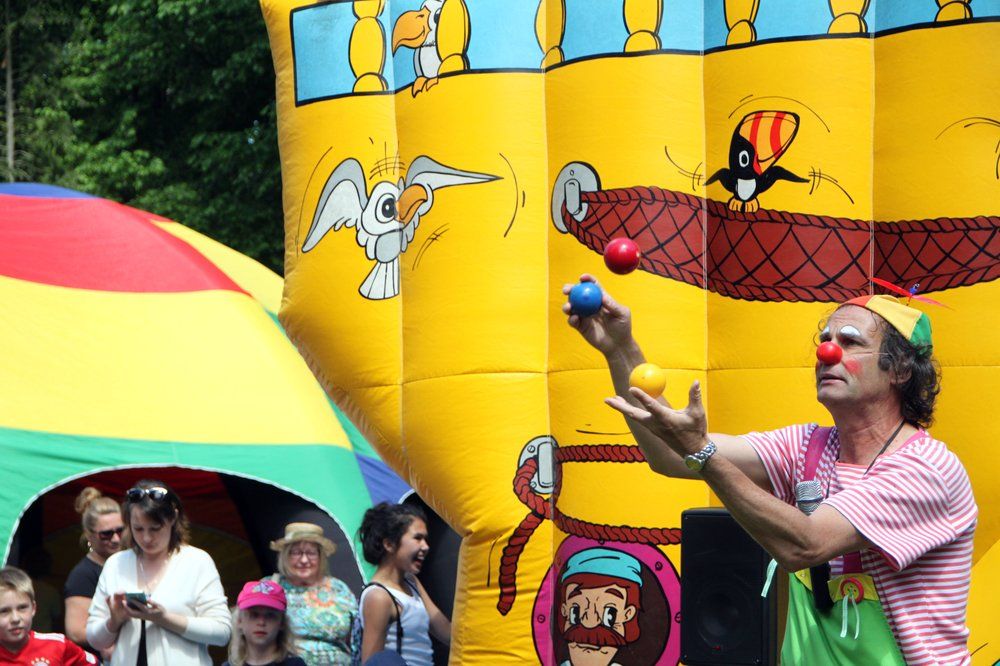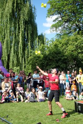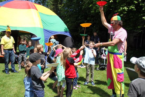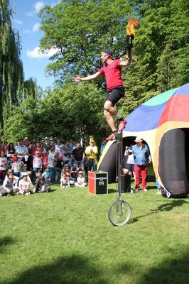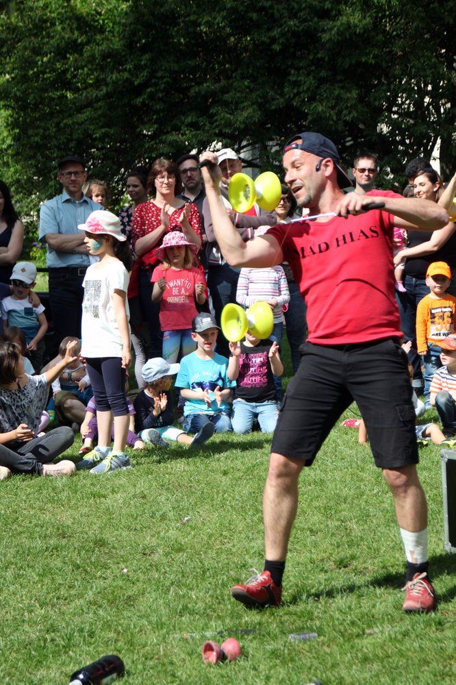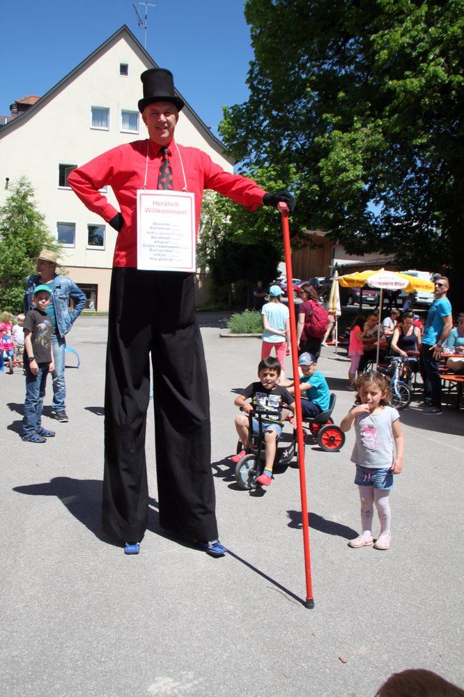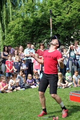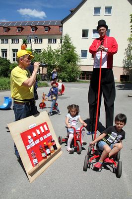Viele Kinder und auch einige Erwachsene begeisterten sich unter Anleitung von Bettina und Manuela für den Zumba-Tanz. Bestaunt wurde der „ganz große Mann“ Fred Meier aus Kehlheim. Er ist Stelzenlaufweltmeister und mehrfacher Weltrekordhalter im Glasscherbenlauf. Zu ihm mussten nicht nur die Kinder ganz hoch hinauf schauen. Bei Toni Toss aus Moosach konnten Kids und Erwachsene in einem Workshop Grundkenntnisse im Jonglieren erwerben bevor er – Mitglied von „Clowns ohne Grenzen“ - bei seinem Clowntheater seine lustigen Künste zeigte – gar mit sechs Bällen oder mit Keulen, Abflusspumpe und Clobürste jonglierte, Hokuspokus Farben in ein Malbuch zauberte. Zum Staunen brachte der Mad Hias aus Beilngries seine Zuschauer als er gleich mit zwei Diabolus Kunststücke vorführte und besonders als er auf einem zweieinhalb Meter hohen Einrad mit drei brennenden Fackeln jonglierte.