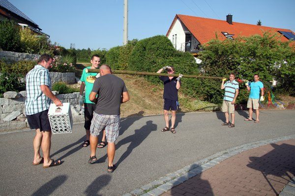 Der „mächtige“ Kirwabaum wurde mit vielen „Hau-Rucks“ – von den „Bergler-Kirwa-Burschen“ aufgestellt und nach getaner Arbeit mit Kirwabier begossen, denn bei den „Sahara-Temperaturen“ war das Baum aufstellen schweißtreibend. Er ist zwar „nicht ganz“ so groß wie die 33-Meter-Fichte der Ensdorfer Kirwaleute bei der Jakobi-Kirwa – aber immerhin: „Er ist der höchste (über dem Meeresspiegel) im ganzen unteren Vilstal!“ Von den hübschen „Kirwamoidln“, war zuvor der Gipfel mit weiß-blauen Bändern geschmückt worden.