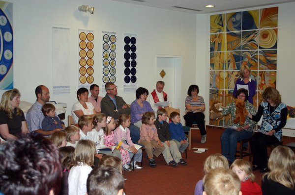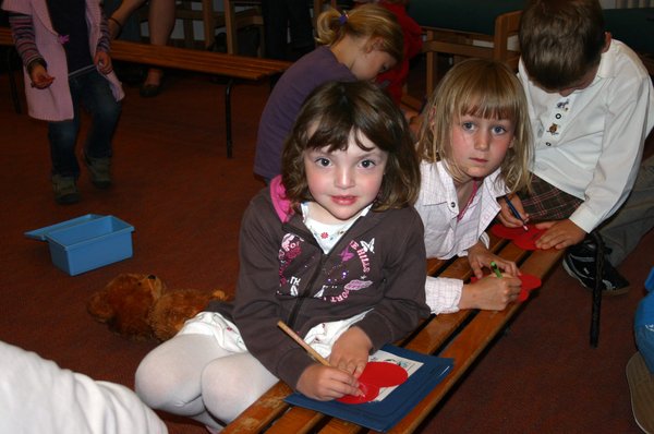 „Wenn einer sagt, ich mag dich, du …“ sangen alle nach dem Gleichnis. Dann malten und schrieben die Kinder auf zuvor ausgeschnittene rote Papp-Herzen die Namen der Personen, die sie ganz besonders lieben und gern haben, und steckten es zu einem „großen Herzen voller Liebe und Freundschaft“ zusammen. In Fürbitten beteten zu Gott, dass er ihnen ehrliche Freunde schenke, dass sie selbst treue und verlässliche Freunde sind und jeden annehmen, so wie er ist, anerkennen, dass jeder wertvoll ist. Nach dem gemeinsamen Vaterunser wurde „Kommt, sagt es allen Leuten …“ gesungen, bevor Pfarrer Sturm das Segensgebet sprach: „Gott, du hast Menschen geschaffen, jeden nach seiner eigenen Art. Gib uns die Einsicht, dass wir den anderen akzeptieren und so annehmen können, wie er ist.