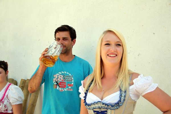 Traditionell wurde dann der Baum von heuer 32 starken Burschen und Männern an sieben „Goaßn“ und viel „Armschmalz“ in die Senkrechte gebracht. Eine schweißtreibende Arbeit. Da mussten sich die Kirwaburschen und ihre Helfer mächtig ins Zeug legen. „Mai ham mir an Durscht!“ brauchten sie gar nicht erst zu rufen. Die Kirwamoidln eilten gleich herbei, um mit Gerstensaft dafür zu sorgen, dass das „Schmalz“ nicht ausging.