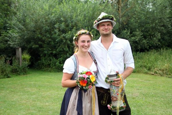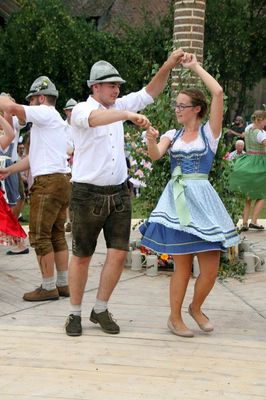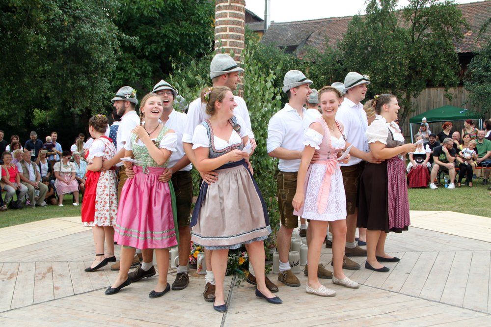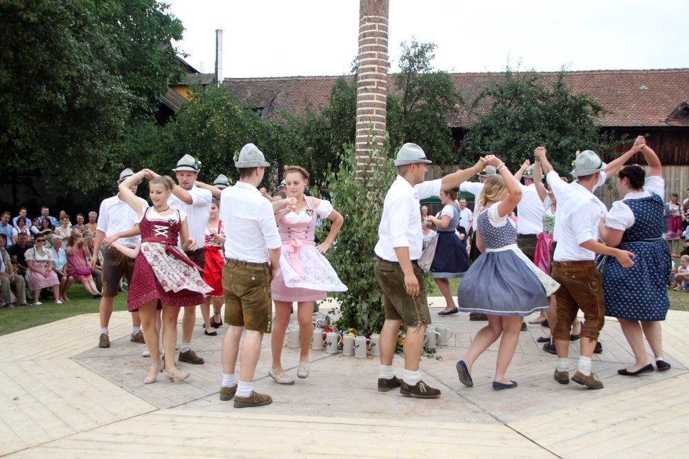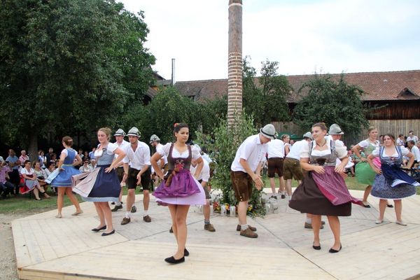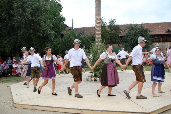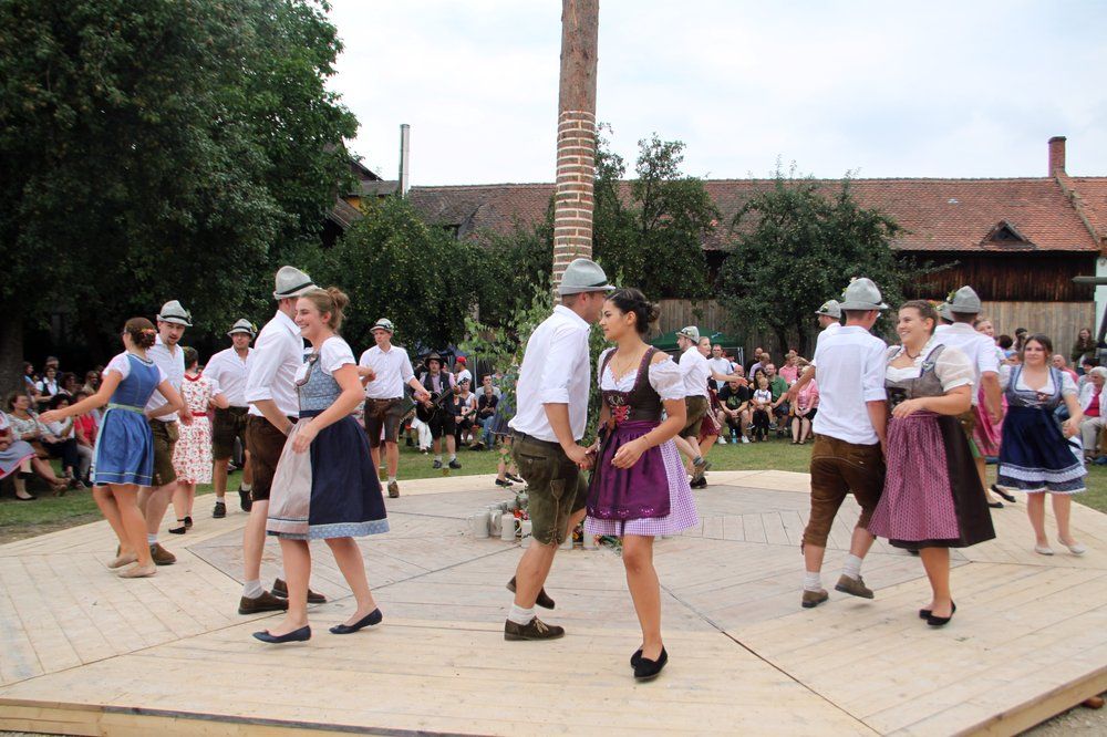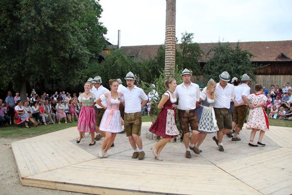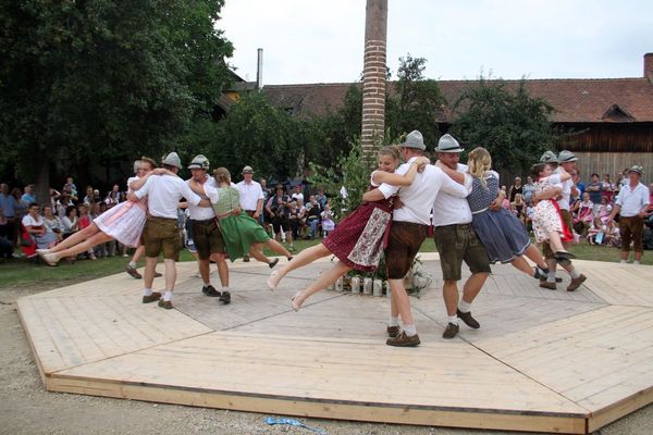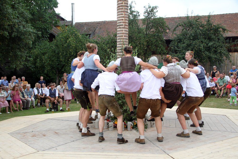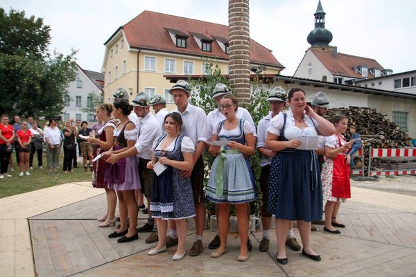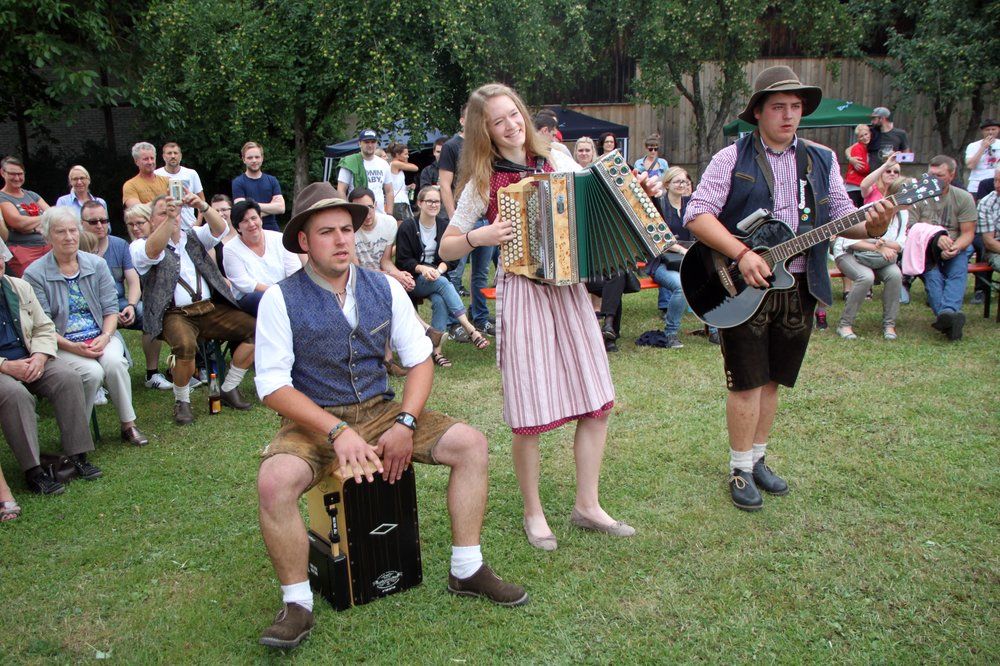 „Sternpolka“ und „S’ Fensterl“, „Hupferl“, „Ausanand – Zuaranand“ und „Plattler“, Walzer und Ehrendreher wurden getanzt. Musikalisch begleitet wurden die Kirwapaare dabei sie von den drei jungen Riedenern Johannes Haas am Cajon, Theresa Weinfurtner auf ihrer Quetschn und von Philipp Haas auf der Gitarre“, „der „besten Kirwamusi“. Die reife tänzerische Leistung – von Juchzern und den Fragen nach der besten Kirwa, den schönsten Kirwamoidln und feschesten Kirwaboum sowie dem „best natürlich gewachsenen Kirwabaum“ und „wer hot des schöjnste Kirwawetter?“ unterbrochen – „Mir ham’s natürlich!“ – wurde von vielen Besuchern und Schaulustigen beklatscht.