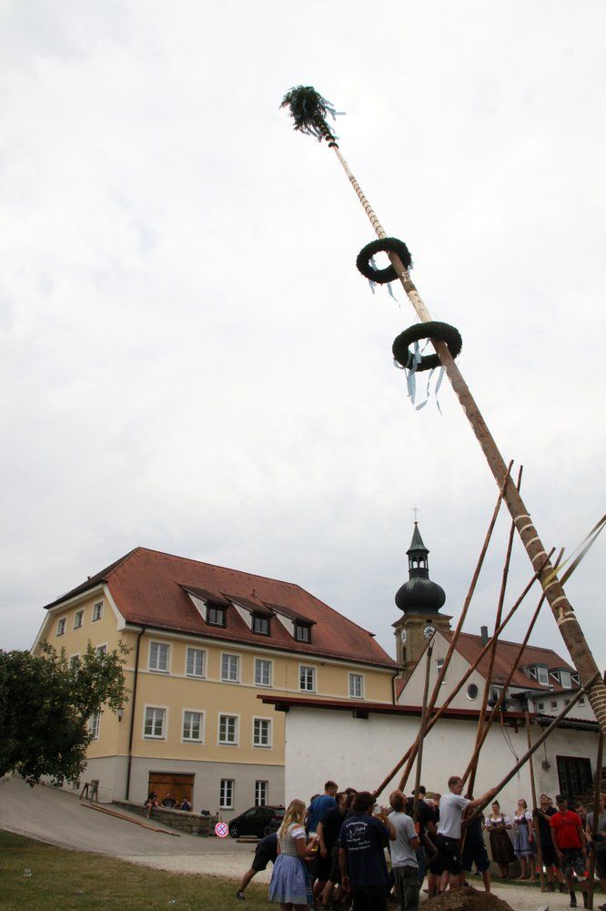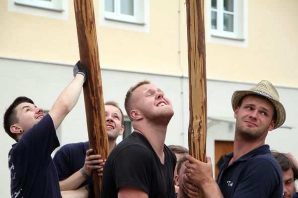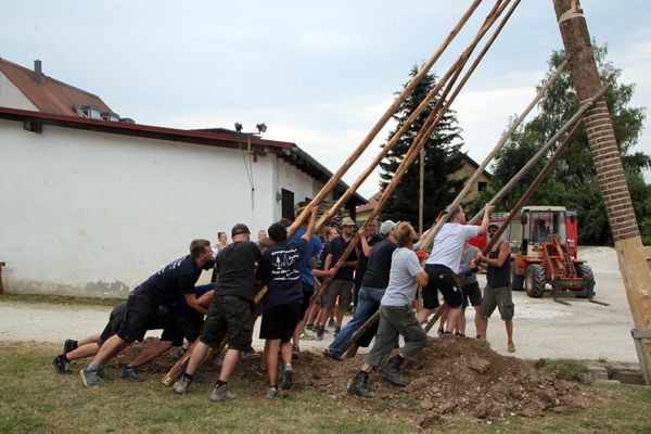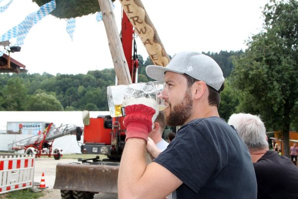 Traditionell wurde dann der Baum heuer von 32 starken Burschen und Männern an fünf „Goaßn“ und viel „Armschmalz“ in die Senkrechte gebracht. Eine anstrengende Arbeit. Da mussten sich die Kirwaburschen und ihre Helfer mächtig ins Zeug legen. „Mai ham mir an Durscht!“ brauchten sie gar nicht erst zu rufen. Die Kirwamoidln eilten gleich herbei, um mit Gerstensaft dafür zu sorgen, dass das „Schmalz“ nicht ausging.