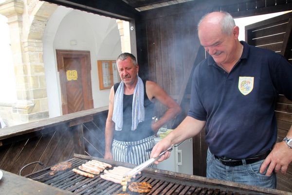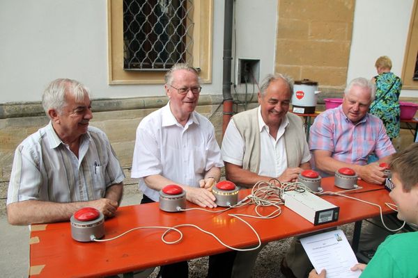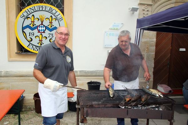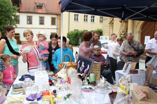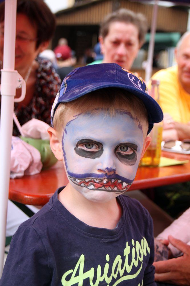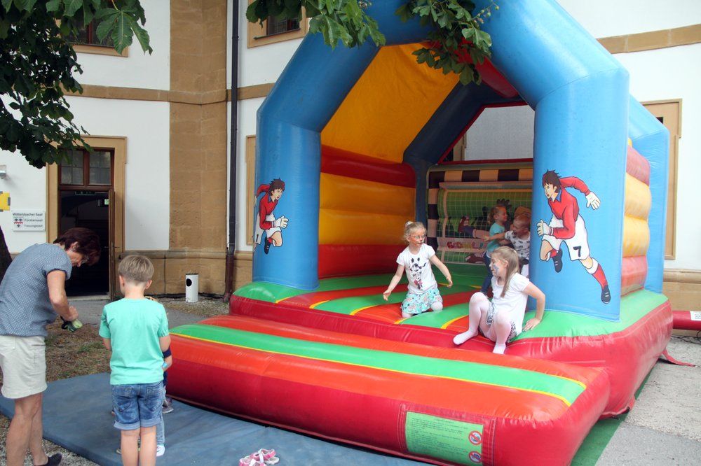 Zum anschließenden „weltlichen“ Kirchenfest wünschte Pfarrer Sturm „einen schönen Nachmittag ohne Sonnen- und Regenschirm“. Regenschirm brauchte jedenfalls keiner der vielen Besucher. Nicht beim musikalischen Frühschoppen mit der Blaskapelle Ensdorf und auch später höchstens ab und zu Sonnenschirme. Den Erlös des Kirchenfestes spendeten die vielen teilnehmenden Vereine für die Kirchensanierung. Der Pfarrgemeinderat verkaufte dafür Kaffe, Kuchen und Kücheln, der Krieger- und Reservistenverein grillte Bratwürstl und Steaks, der Schnupferclub Makrelen, die Freiwillige Feuerwehr verkaufte Fischsemmeln und Käse, die Pfadfinder boten Waffeln und Crepes an, hatten zudem die Bedienung übernommen, während die Wanderfreunde für den Getränkeausschank zuständig waren. Die Schützengesellschaft Edelweiß Wolfsbach hatte einen Pilsstand aufgebaut. Eine große Tombola mit vielen schönen Preisen hatte der Obst- und Gartenbauverein organisiert. Hier war auch die informative Festschrift zu erwerben. Die DJK hatte für Kinder eine Hüpfburg aufgebaut und lud Jung und Alt zum Torwandschießen ein. Johann Frind schminkte Kinder fantasievoll und verpasste ihnen auf Wunsch auch „vergängliche“ Tatoos. Der Offene Treff hatte einen Maltisch für die Kinder parat und befragte bei einem Quiz mit 27 kniffligen Fragen Besucher „Was wisst ihr über unsere Pfarrgemeinde?“ Beim Promi-Quiz siegte natürlich Pfarrer Pater Hermann Sturm. Natürlich konnte man auch die Pfarrkirche St. Jakobus besichtigen und sich vom Fortschritt der Sanierung überzeugen, die bereits restaurierten Asamfresken bewundern.
