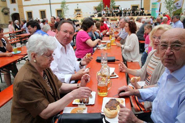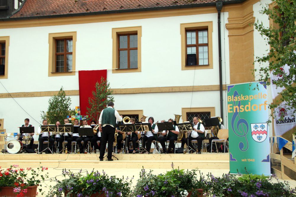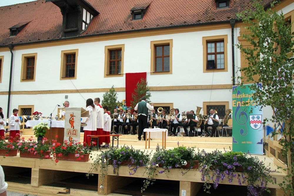 Das Fest begann mit einem feierlichen Gottesdienst im Freien auf der Bühne, den Pfarrer Pater Hermann Sturm – musikalisch umrahmt von der Blaskapelle Ensdorf unter Leitung von Hubert Haller – zelebrierte. „Was weist mich als Christ aus?“ fragte der Geistliche die vielen Gläubigen in seiner Predigt, Er zitierte aus der Bibel den Hl. Johannes: Ein Christ ist ein Mensch, der sich zu Jesus Christus bekennt, sich an seine Weisung hält. Ein Christ ohne persönliche Beziehung zu Jesus Christus ist nach Pfarrer Sturm wie ein Karton ohne Inhalt. „Glaube, Christentum wird nicht dadurch weitergegeben, indem man Menschen ein Lehrbuch in die Hand drückt, sondern durch Christen in der Familie, am Arbeitsplatz, die überzeugen und ihr Christsein leben und bezeugen. Am Beispiel gläubiger Menschen entzündet sich der Glaube.“ Letztlich gelte: „Wir sind Kirche aus lebendigen Steinen. Die Kirche ist nur so lebendig und attraktiv las es ihre Mitglieder sind. Die Zukunft der Kirche liegt in einer lebendigen Gemeinde von Jung und Alt! Viele kleine Leute an vielen kleinen Orten, die viele kleine Schritte tun, können das Gesicht der Welt verändern und so Gottes Reich erfahrbar machen.“