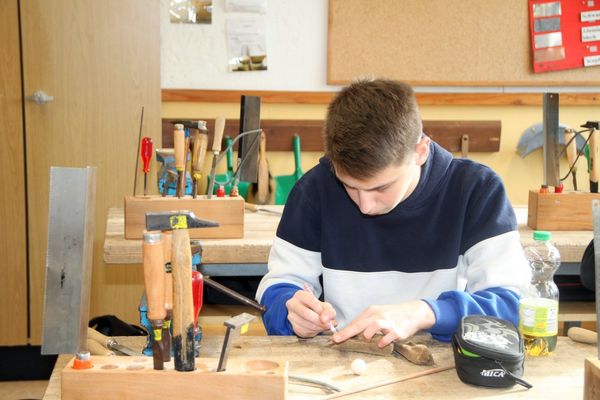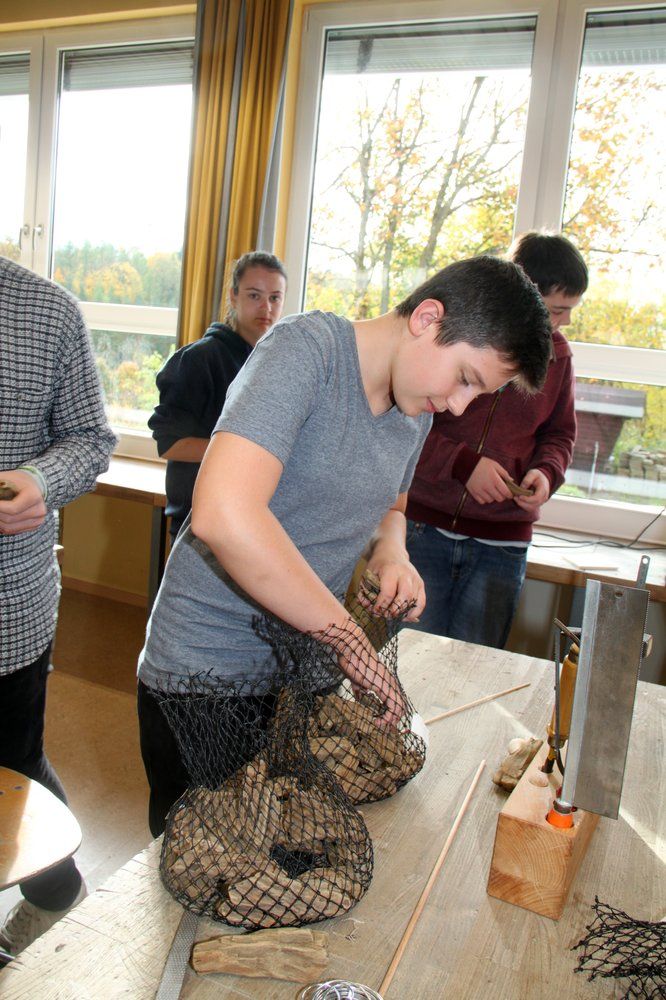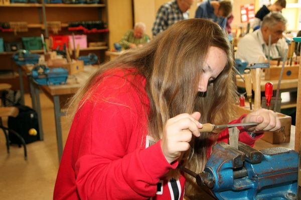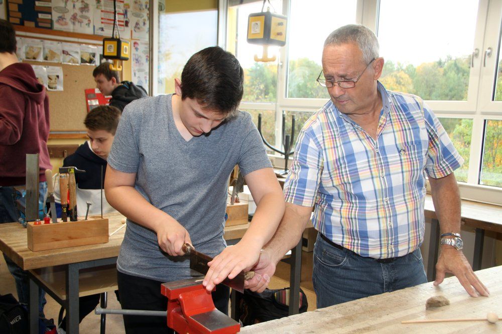 Im Werkraum der Mittelschule bastelte die Gruppe Technik der 9. Klasse mit Fachlehrerin Anita Hirsch und vier Opas Weihnachtsengel aus Treibholz. Da wurde an der elektrischen Bohrmaschine gebohrt, wurde geschliffen und gedübelt. Als gestalterisches Element wurden von den Schülerinnen und Schülern die Flügel selbst entworfen und aus Alu-Blech geschnitten. Am Engelskopf aus einer Buchenholzkugel wurde schließlich der Heiligenschein aus Alu-Draht befestigt. „Jung und Alt begegneten sich in schöpferischer Arbeit, arbeiten zusammen und gaben sich gegenseitig Tipps.“