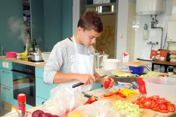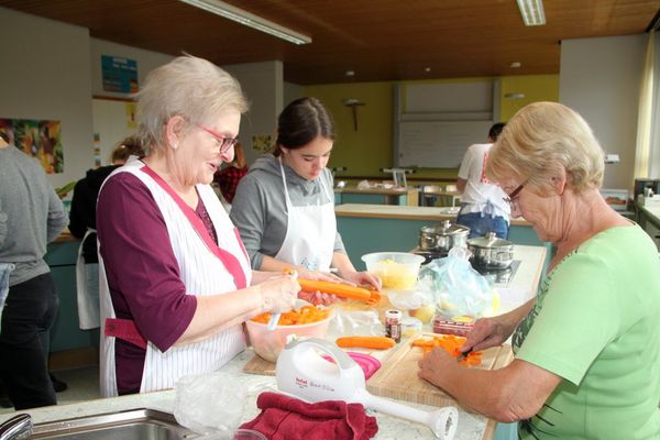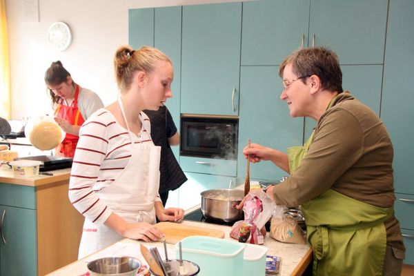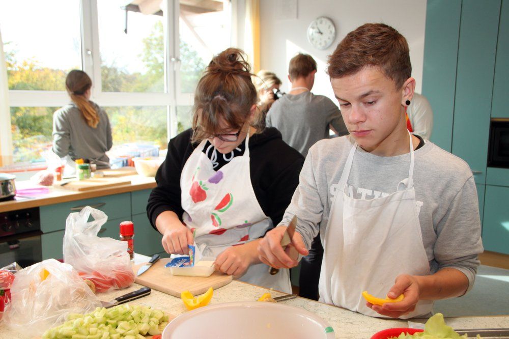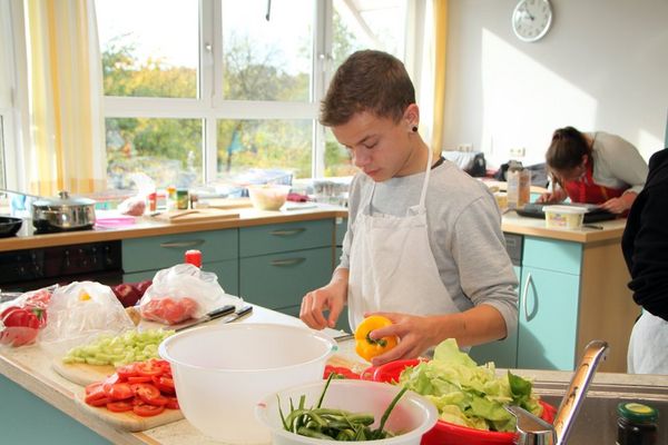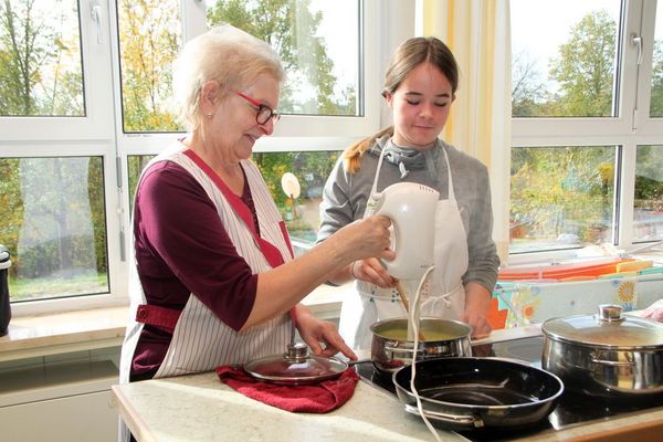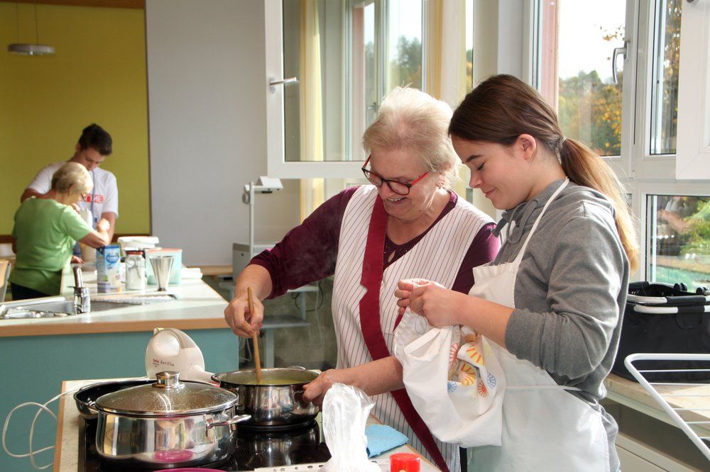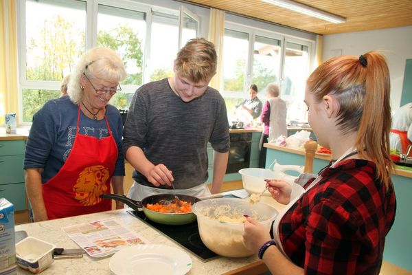 In der Schulküche der Mittelschule Ensdorf wurde gleichzeitig eifrig gekocht und gebacken. Vier Buben und fünf Mädchen der Gruppe Soziales der 9. Klasse waren zusammen mit Fachlehrerin Agnes Kramer und drei Omas am Werk. „Griechisch“ stand auf dem Stundenplan. Schon bald duftete es verführerisch. Zusammenarbeit – Teamwork eben, war erforderlich, um die leckeren Speisen „termingerecht“ auf die Teller zu bringen. Schließlich sollte alles für das gemeinsame Mittagessen auf den gedeckten Tischen sein. Als Vorspeise gab es Gemüse- und Reissuppe, als Hauptspeise deftigen Hackfleischeintopf, Nudelauflauf mit Schinken, Griechischen Salat und als Nachspeise Kaiserschmarrn, Haselnusskuchen, Quarkröllchen, Schokoladenpudding und Obstsalat. Einhelliges Urteil: „Ein vorzügliches leckeres Mittagessen, das super schmeckte. Optisch perfekt angerichtet.“
