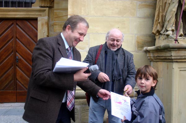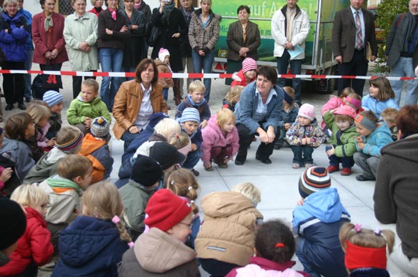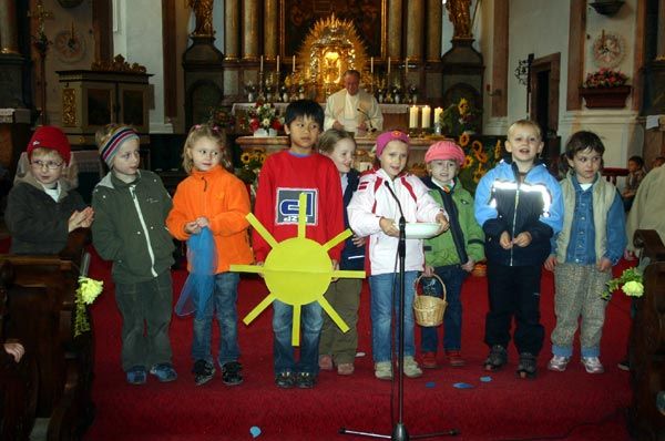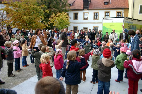Heide Moser dankte für die Auszeichnung und den allen 50 Kindern der Bären- und Elefantengruppe und den 25 Erstklässlern für ihre Mitarbeit beim Musizieren, Singen und Tanzen. „Ihr seid ja die Hauptpersonen!“ Und diese hatten zur Freude der vielen Gäste – Eltern und Geschwister – vor der Kirche „Der Herbst, der Herbst ist da“ gesungen und mimisch gespielt, dann das kleine Singspiel „Du komm her zu mir!“ aufgeführt und „Ich hol eine Leiter und steige auf den Apfelbaum“. (Mittelbayerische Zeitung)