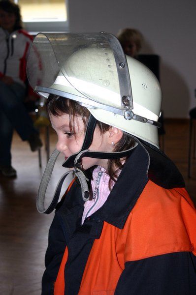 Dann durften die Kinder die persönliche Ausrüstung der Feuerwehrleute anprobieren: die großen Hosen und Jacken, die schweren Stiefel mit den Stahlkappen, und die Helme. Für die Schutzhandschuhe waren ihre Finger dann doch noch zu klein.