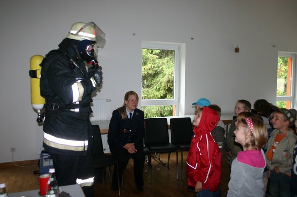Anschließend erfuhren die Kinder einiges über das richtige Verhalten bei Bränden: Türen und Fenster schließen, Licht anmachen, keine Panik und natürlich: Die Feuerwehr unter der Nummer 112 rufen und melden wo was passiert ist, wer meldet und ob noch Personen in der Wohnung sind. Zur Übung spielten sie Brandmelder und Feuerwehrzentrale am Telefon.