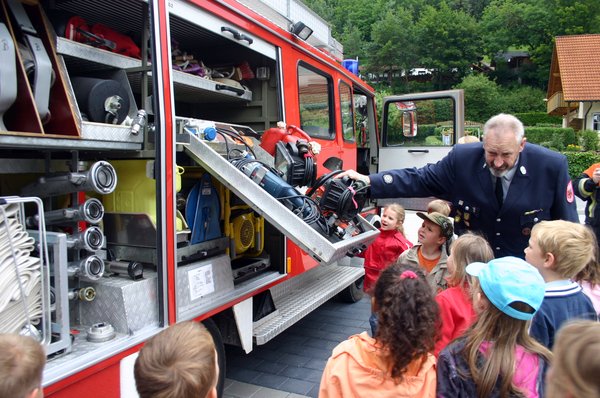 Zum Schluss wurde den Kindern die Ausrüstung in den beiden Feuerwehrfahrzeugen vorgeführt. Sie durften auch mal einen Schlauch aufrollen, ein Strahlrohr in die Hand nehmen oder die Kellen zur Verkehrsregelung. Die großen Geräte wie Spreizer, Rettungsschere und Hochdrucklöscher interessierten vor allem die Buben. Und natürlich die Feuerwehrautos mit Blaulicht und Martinshorn selbst!
