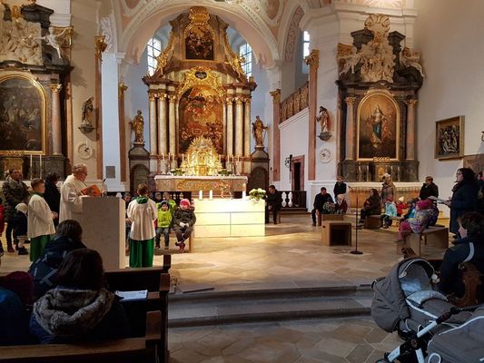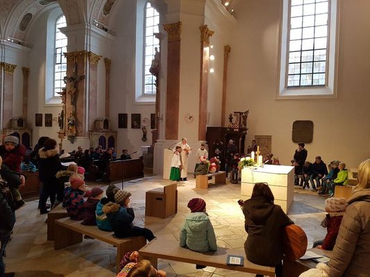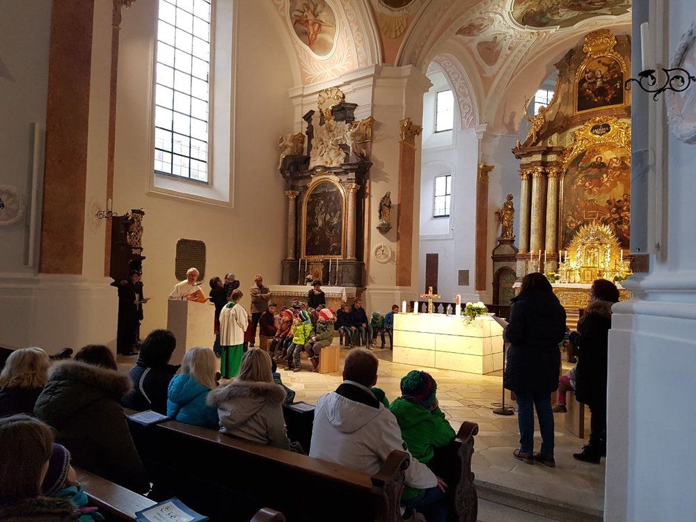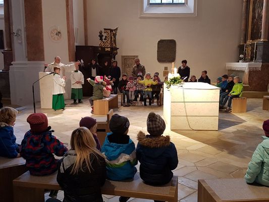„Hier kommen Menschen zum Gebet und zur Messfeier zusammen, hier können wir Gottes Nähe in besonderer Weise erfahren. In dieser Kirche wohnt Gott“ erläuterte Martha Wein im Vorraum der Kirche. Dann ging es weiter zum Weihwasserbecken, wo sich alle bekreuzigten. Beim Einzug wurde „Wir feiern heut ein Fest“ gesungen und im Mittelgang beim Kreuz stehengeblieben. Weiter ging zum Altarraum, wo Kerzen entzündet wurden. Pfarrer Pater Hermann Sturm verwies darauf, dass der Altar ein besonders wichtiger Ort in der Kirche ist. „Um den Altar, was Tisch bedeutet, versammeln sich die Christen zur Messfeier. Dabei erinnern sie sich an das letzte Abendmahl, das Jesus mit seinen Freunden kurz vor seinem Tod gefeiert hat.“ Erklärt wurde die Bedeutung von Mesner und Ministranten als Helfer während des Gottesdienstes. Die Kinder durften die Glocken läuten. Besichtigt wurden auch das Ewige Licht und der Tabernakel, in dem die Hostien, das Heilige Brot, der Leib Christi, aufbewahrt wird. Am Ambo (Lesepult) werden im Gottesdienst die Geschichten und Texte aus der Bibel und aus dem Neuen Testament das Evangelium vorgelesen und die Predigt gehalten. Nach dem Vater unser ging die „Entdeckungstour“ weiter zum Taufbecken und der Osterkerze und zur Marienfigur. Hier wurden Dankgebete an die Gottesmutter gesprochen.