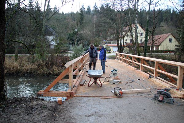 Als Holz wurde Lärchenholz gewählt, da es umweltfreundlicher ist als kesseldruckimprägniertes Fichtenholz (imprägniertes Holz ist bei der Entsorgung Sondermüll). Zur Verstärkung der Unterkonstruktion wurden sechs Stahlträger zusätzlich mit eingebaut und befestigt, damit die Tragfähigkeit der Brücke gestärkt und gesichert wird. Die Gesamtkosten der Maßnahme wurden auf rund 47 000 Euro geschätzt.