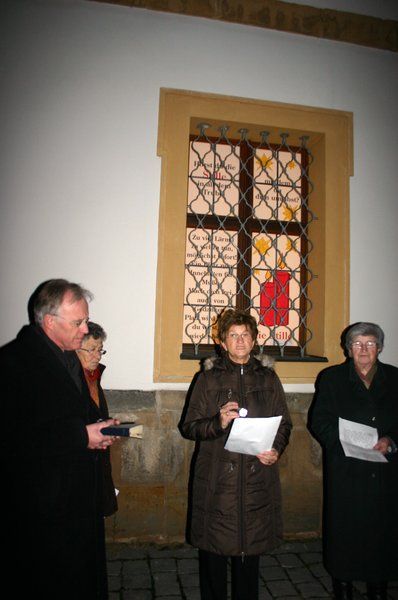„Geh deinen inneren Weg durch die Tage des Advents“, forderte Johanna Breitkopf die vielen Menschen auf, die zur Eröffnung des 2. Fensters gekommen waren. „Bewahre dir, wenn es möglich ist, Zeit, in der dein Atem ruhig geht, in der nicht gehetzt und gerannt wird. Es soll ja etwas in dir selbst geschehen. Richte deine Gedanken auf das, was sich lohnt. Höre auf die Stille in dir. Einen gesegneten Advent wünsche ich dir.“