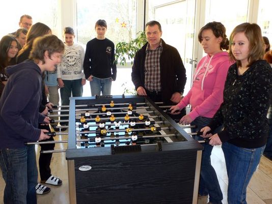 In den Pausen und Wartezeiten besteht nun mit Tischfußball eine neue Betätigungsmöglichkeit, die in letzter Zeit bei den Jugendlichen wieder zunehmend ins Interesse gerückt ist. Tischfußball als spannende Form des Zeitvertreibs und „sportlichen“ Wettbewerbs erfreut sich zunehmender Beliebtheit. Das dazu notwendige Equipment konnte nun durch die Unterstützung von Gemeinde und Raiffeisenbank bereitgestellt werden und – wie man sieht – auch sofort von den Schülerinnen und Schülern in Beschlag genommen werden.