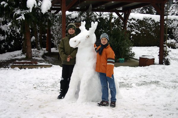 Am Freitag bauten nach den Schneefällen der letzten Tage Lukas und Daniel Fröhlich mit ihrem Vater Rainer im Garten in der Burgstallstraße 26 mit Begeisterung, Mühe und Können eine Riesenskulptur aus Schnee. Das prächtige Rentier hat eine Höhe von 1,60 Metern. Bleibt nur zu hoffen, dass der Frost anhält, damit das Schneekunstwerk noch lange zu sehen ist.