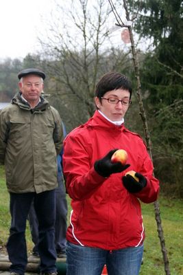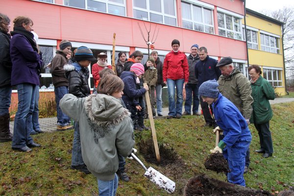 Dann schritten die Kinder zur Tat und pflanzten unter Anleitung der Mitglieder des Obst- und Gartenbauvereins ganz fachgerecht den Apfelbaum der Sorte „Rote Goldparmäne“, einen kernigen Winterapfel. Dabei tat sich vor allem der Schüler Alexander Piehler tatkräftig hervor. Auch durch sein erstaunliches Fachwissen glänzte er. Gartenfachberaterin Michaela Basler erklärte den Kindern, dass jeder Apfel anders schmeckt und es alleine in Deutschland über 2500 verschiedene Apfelsorten gibt. Man könne diese z. B. nach Geschmack, Form und Farbe unterscheiden. Zum Probieren hatte sie zwei große Körbe mit Äpfeln verschiedener Sorten mitgebracht. Schülerin Jana Vermöhlen „taufte“ den Baum auf den Namen „Herbert“, denn sie will eine persönliche Beziehung zu ihm aufbauen.