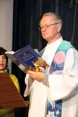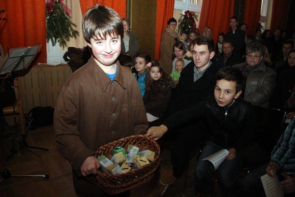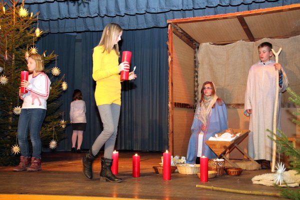 „Jesus, Christuskind, du bist das Licht der Welt. Mit dir wollen wir die Welt hell und warm machen“, erklärte Pfarrer Sturm. Die Kinder beteten „Wir bringen ein Licht zu allen, die lieblos und kalt behandelt werden. Wir wollen Licht bringen zu denen, die hungern; das Licht des Glaubens zu allen, die nicht glauben können; das Licht des Friedens zu allen, die sich zanken und streiten; das Licht der Liebe zu allen, die ausgestoßen werden, die einsam und allein sind. Wir bringen das Licht der Freude zu allen, die traurig sind.“ Nach dem Vater unser spendete Pfarrer Pater Hermann Sturm den Weihnachtssegen. Während der Saal verdunkelt wurde und die Christbäume entzündet wurden, intonierte die „Neue Band“ zum Abschluss „Stille Nacht, heilige Nacht“ und alle sangen andächtig mit.