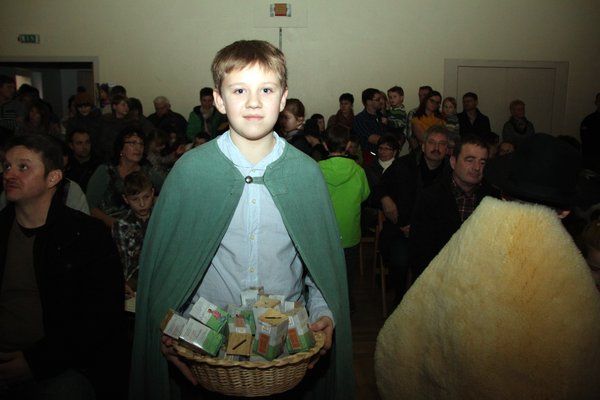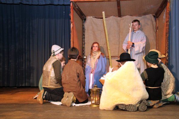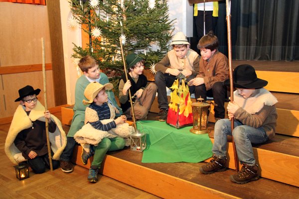 Nach einem Instrumentalstück verlas Pfarrer Sturm das Weihnachtsevangelium aus der Kinderbibel und alle sangen „Zu Bethlehem geboren ist uns ein Kindelein“. „Draußen auf den Feldern waren Hirten bei der Arbeit, trieben ihre Schafe zusammen und hielten, damit sie nicht froren, in Mäntel und Decken gehüllt Nachtwache bei der Herde“, berichtete der Erzähler. „Heute Nacht ist es irgendwie komisch“, meinte einer. „Alles ist so ruhig. Ganz anders als sonst“, ein anderer. „Selbst die Schafe schlafen alle und die Hunde liegen ganz ruhig da“ ein anderer. „Ich habe trotzdem ein ganz komisches Gefühl. Irgendetwas liegt heute in der Luft“, war sich ein weiterer sicher, „Das Licht ist auch ganz eigenartig! Wir sollten der Sache auf den Grund gehen. Kommt, lasst uns suchen.“ Nachdem sich die Hirten auf den Weg gemacht hatten, leuchtete plötzlich ein helles Licht auf. Ein Engel erschien und verkündete ihnen, dass der Heiland geboren wurde, Voll Freude machten sie sich auf den Weg und fanden das Kind in einer Futterkrippe“ erzählte Sophie Graf weiter. Und die Hirten staunten. „Gott kommt nicht in dem Haus eines reichen Kaufmanns zur Welt oder im Palast eines Königs! Nein! In einem Stall am Rande eines kleinen Dorfes!“ Überwältigt von dem, was sie sahen, knieten die fünf Hirten nieder und beteten das kleine Kind an. „Kommet ihr Hirten“ sangen alle. Während die Hirten die Adveniatopferkästchen der Kinder für „Kinder auf der Flucht“ einsammelten und dafür kleine Sternchen verteilten, sang das Volk „Ihr Kinderlein kommet“.