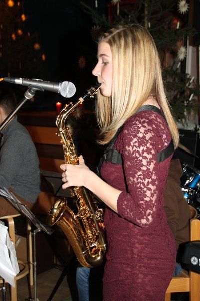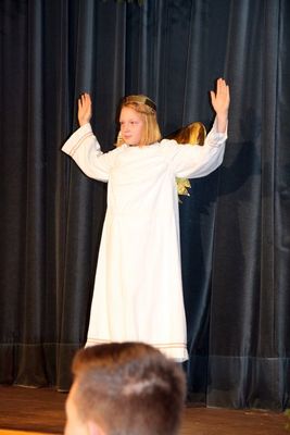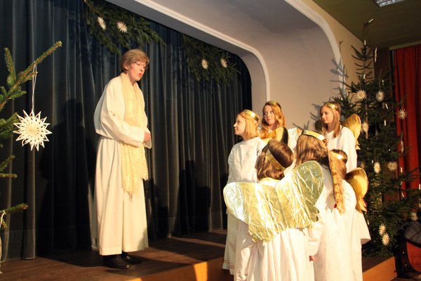„Seht, die gute Zeit ist nah“ spielte und sang zum Anfang die Band und der Geistliche betonte:„Wir feiern heute ein kleines Kind. Jesus, der zu uns und für uns auf die Welt kam.“ „Die Englein im Himmel saßen zusammen. Sie machten sich Gedanken über die Menschen, da die Welt so verdorben war. Die Menschen bekämpften sich gegenseitig, sie logen einander an, sie stahlen und gaben überhaupt nicht mehr auf einander acht, nicht einmal mehr die Kinder hatten Respekt vor ihren Eltern“, verkündete Sophie Graf als Erzählerin des Krippenspiels. „Der liebe Gott sollte die Menschen ausrotten! Am besten lässt er Feuer vom Himmel regnen!“ schlug einer der Engel mit den goldenen Flügeln vor. Ein anderer war für eine große Flut wie damals bei Noah. Ein anderer für Epidemien. Wieder ein anderer für einen Weltkrieg, bei dem sich die Menschen selbst vernichten. Erzengel Gabriel (Agnes Graf) hörte sie eine Weile diskutieren und erklärte dann, dass Gott sich eine ganz andere Lösung habe einfallen lassen: „Gott schickt einen Retter zu den Menschen! Er wird als Baby in Bethlehem geboren.“