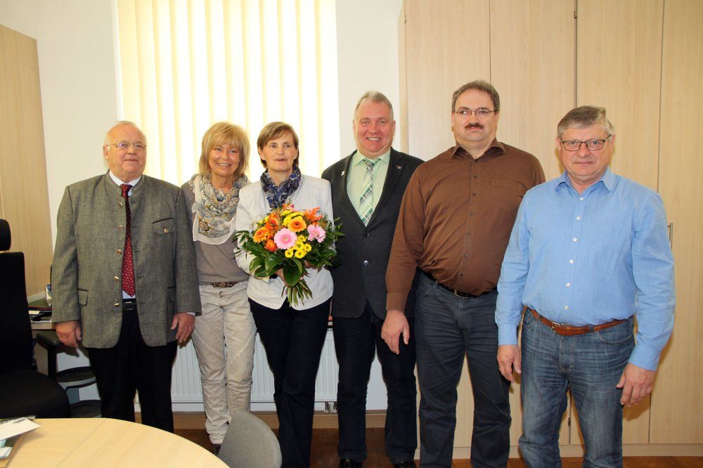 Bürgermeister Markus Dollacker gratulierte seiner „Frontfrau“ im Rathaus zusammen mit seinem Stellvertreter Karl Roppert und dem übrigen Verwaltungspersonal mit Blumen und einem Geschenkkorb zum Dienstjubiläum.