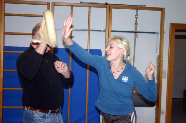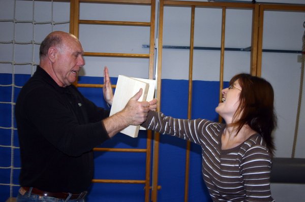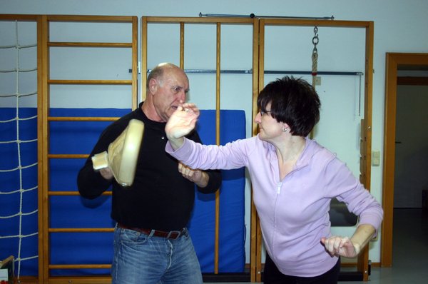 Kursleiter Klaus Inderst, Vorsitzender und Trainer des Kampfsport-Club Amberg vermittelte ihnen in Theorie und Praxis wie man richtig fällt, den Kopf stützt und schützt, brachte ihnen bei, Angstzustände und Stress zu bewältigen, und lernte den Damen Handballenstoß sowie Befreiung aus Hand-, Würge- und Festhaltegriffen. Zum Abschluss zeigten sie den richtigen Handballenstoß und durchschlugen als Demonstration ihrer Kraft zu einem Kampfschrei mit der Hand 28 Millimeter starke Massivholzbretter aus Fichte.