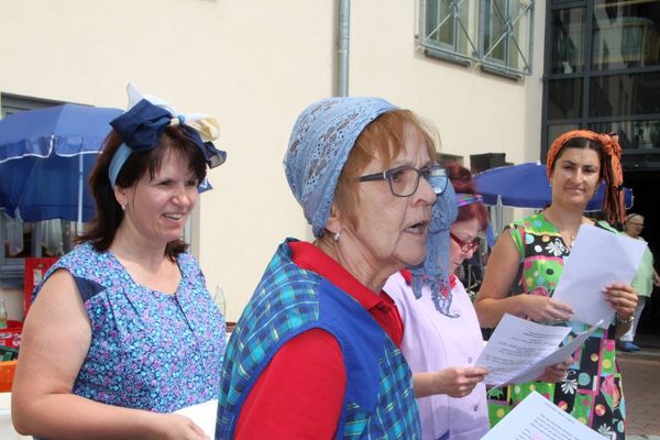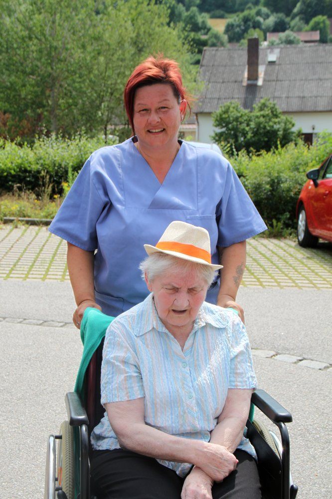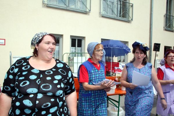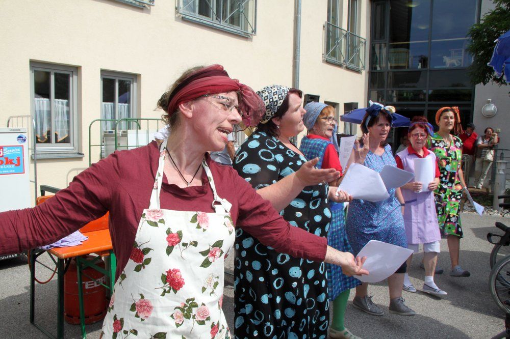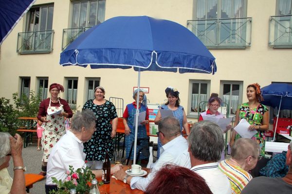 Den ganzen Nachmittag spielte der Rieger Hans in seiner gewohnt zünftigen Art u. a. „I bin fidel …“, „Mir san vom Wold dahoam“, „Es war im Böhmerwald“, „Lass die Sonne in dein Herz“, „Du schwarzer Zigeuner“, „Hallo Marilou“, „Rote Rosen, rote Lippen, roter Wein“ und fleißig weiter alte Schlager und Stimmungsmusik auf seinem Akkordeon. Mit den Senioren feierten ihre Kinder, zum Teil auch mit Enkeln und Urenkeln fröhlich das Sommerfest. Viel Applaus erhielten die Schwestern und anderen Beschäftigten des Seniorenheims für ihren Auftritt als „Schachtl-Ballett“ zur Melodie der alten Dampfeisenbahn - auf bayrisch natürlich. Manche lachten Tränen über die lustigen Texte und gekonnte Vorführung der „Alten Schachteln“. „Wir san des Schach-, Schach-, Schachtlballett, schaut’s uns doch o, san mir niat nett? Wir ham all, all, alle nu koan Mo, obwohl jede viel biet’n ko!“ lautete der Refrain.