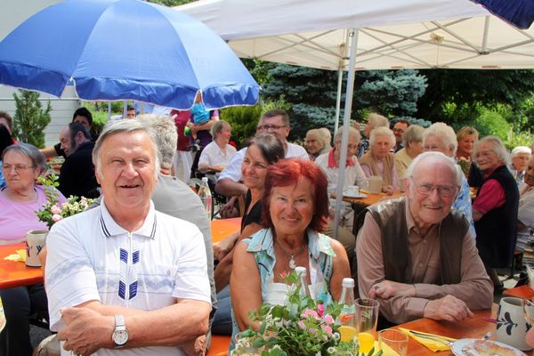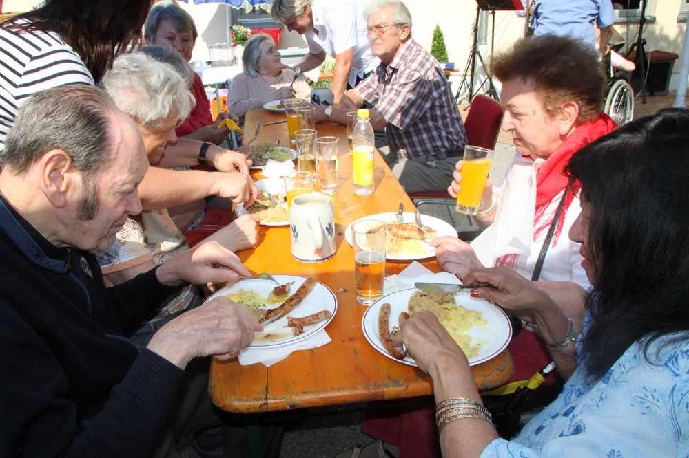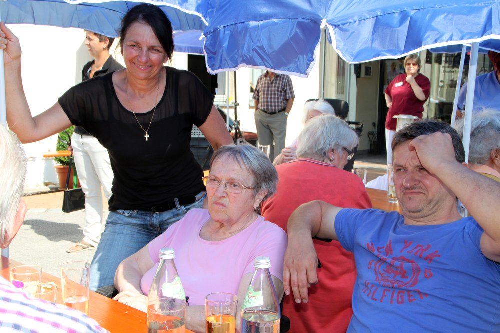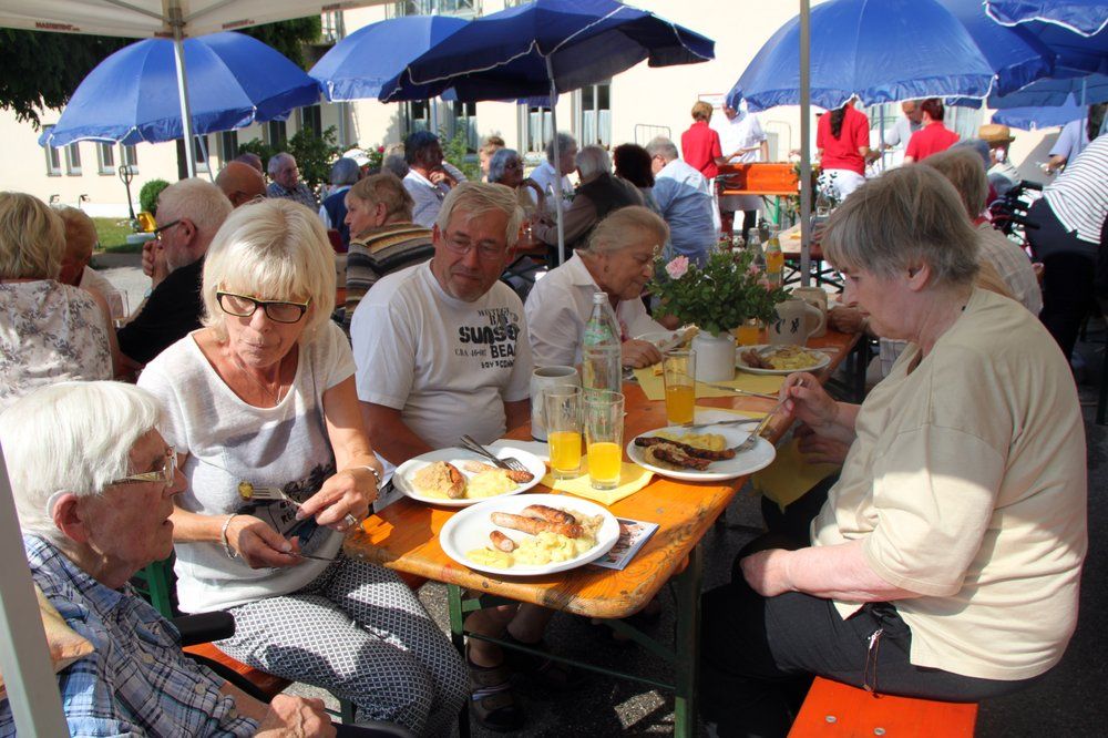 Heimleiterin Lydia Brandl begrüßte: „Heuer haben wir wegen der unsicheren Witterung improvisiert. Vormittags hatten wir schon im Garten aufgebaut, jetzt sitzen wir eben „zweigeteilt“ im Foyer und im Freien.“ Ihr ganzes Team mit Sozialbetreuerin Elke Augsberger hatten das Fest vorbildlich organisiert. Gäste und Heimbewohner wurden liebevoll betreut. Zuerst gab es Kücheln und Erdbeerkuchen, Kaffee oder kühle Getränke. Zum Abendessen servierten „Chefkoch Mario Hellern“ und Hausmeister Georg Faulhaber gegrillte Bratwürstl mit würzigem Kartoffelsalat und deftigem Sauerkraut.