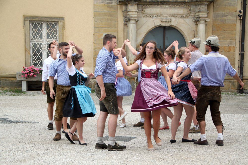 Ein kräftiger Regenguss hielt die Ensdorfer Kirwapaare nicht davon ab, einige Tänze vorzuführen. Die „Sonnenstunden-Gruppe“ zeigte, was sie bei ihren viertägigen Treffen dienstags von 14 bis 16 Uhr alles gelernt haben, Mit gelben Tüchern stellten sie den Tagesablauf „vom Aufgang der Sonne bis zu ihrem Niedergang“ dar und ergänzten „sei gelobet der Name des Herrn.“ Lustig sang die Sonnenstunden-Gruppe „Bin i net a scheena Hahn? Kikerii!“