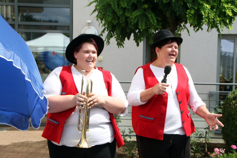 Den ganzen Nachmittag spielte der Markus Gais zünftig auf dem Akkordeon auf. „I bin fidel …“, „Mir san vom Wold dahoam“, „Es war im Böhmerwald“, „Lass die Sonne in dein Herz“, „Du schwarzer Zigeuner“, „Hallo Marilou“, „Rote Rosen, rote Lippen, roter Wein“ und weitere alte Schlager und Stimmungsmusik erklangen. Mit den Senioren feierten ihre Kinder, zum Teil auch mit Enkeln und Urenkeln fröhlich das Sommerfest. Viel Applaus erhielten die Schwestern und anderen Beschäftigten des Seniorenheims für ihren Auftritt bei der „Schlager-Hitparade“.
