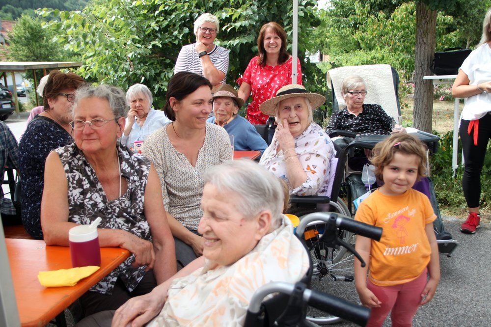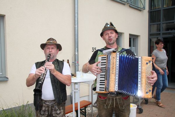 Den ganzen Nachmittag spielten „Fonse und Boose“ zünftig auf Akkordeon und Klarinette auf. „I bin fidel …“, „Mir san vom Wold dahoam“, „Es war im Böhmerwald“, „Lass die Sonne in dein Herz“, „Du schwarzer Zigeuner“, „Hallo Marilou“, „Rote Rosen, rote Lippen, roter Wein“, das Zuchthauslied, „Lustig ist das Zigeunerleben“ „Es war einmal ein treuer Husar“ und weitere alte Schlager und Stimmungsmusik erklangen. Mit den Senioren feierten ihre Kinder, zum Teil auch mit Enkeln und Urenkeln fröhlich das Sommerfest. Viel Applaus erhielten die Schwestern und anderen Beschäftigten des Seniorenheims für ihren Auftritt bei der „Gerichtsverhandlung mit Volksliedern und vor allem für ihre „etwas andere Modenschau“ zur Melodie „Mein Vater war ein Wandersmann“. „Wir haben heute Wandertag. Ein jeder trägt ne Hos’, Guckt nur einmal richtig: Bei uns, da ist was los“, erklärten sie. „Ja Hosen gibt’s für jedermann: Ganz lange, halblang, kurz. Statt Hosen sagt man dann und wann auch Blue Jeans oder Shorts. Dann führten sie verschiedene Exemplare vor: Kniebundhose, Männerunterhose, Trainingshose, Schlafanzug, Arbeitshose und Radlerhose. „ob du jung, ob du alt, ob du dünn oder ob du kugelrund bist, ob du klein, ob du groß . ein jeder braucht ne Hos’“ erklang als Refrain.