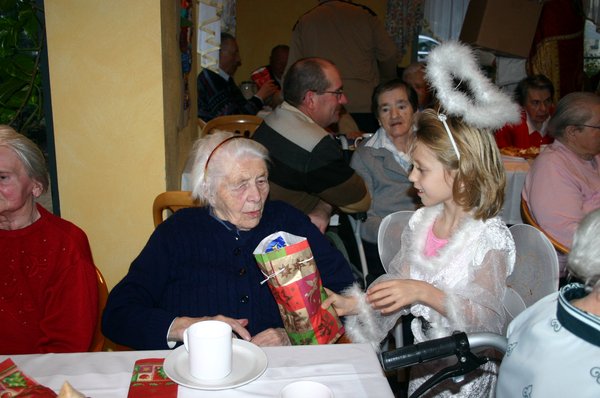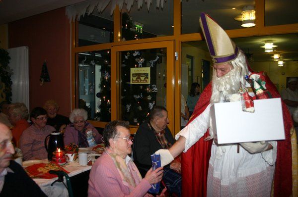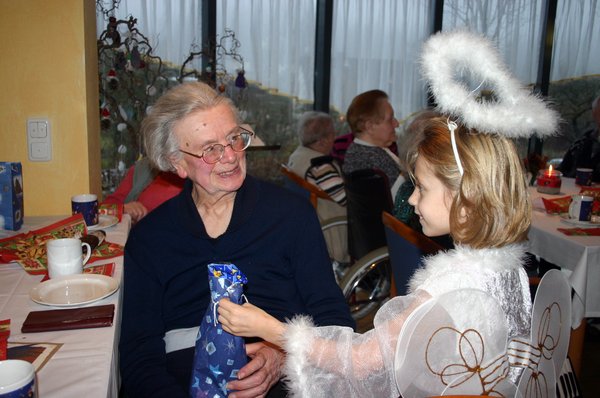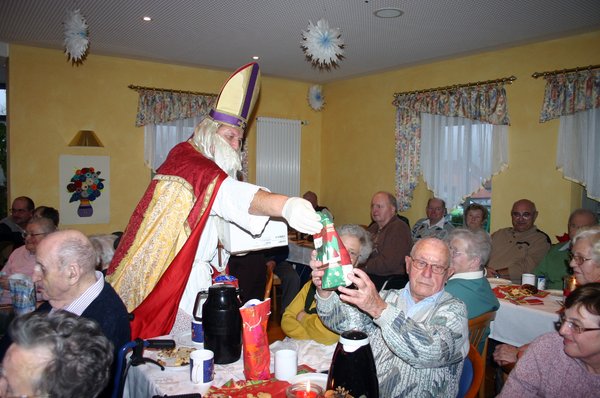 Von Bewohnern selbst gebackene leckere Plätzchen, Stollen, Tee, duftender Punsch und Glühwein von Chefkoch Mario Hellerl schmeckten den Bewohnern mit Genuss. „D’ Hirtn“ (Max Wagner, Werner Meiler, Andreas Reindl, Erich Geitner und Armin Hofrichter) aus Rieden sangen gekonnt und stimmungsvoll „Öitz fanga mir zum Singa an“, „Und öitz is halt Winter woarn“, „O Wunder, was will das bedeuten“ und „Kaam hom die Engl“. Andreas Reindl erzählte die humorvolle Geschichte vom „letzten bayerischen Nikolaus“. Alle sangen „Lasst uns froh und munter sein“, um die Spannung zu mildern, bevor der Nikolaus in Rauchmantel, Mitra und mit Rauschebart in Gestalt von Thomas Fruth mit Knecht Rupprecht Schwester Birgit Heisig endlich erschien. Als Hilfe stand ihnen das siebenjährige Engerl Paula Hellerl zur Seite. Es trug das Gedicht „Wir grüßen Dich im ganzen Haus“ vor und half den beiden beim Austeilen der mit Süßigkeiten, Plätzchen, Orangen und leuchtenden Äpfel gefüllten „Nikolauspackerln“. Manche Senioren freuten sich so darüber, dass ihre Augen verdächtig glänzten. Auch den Bettlägerigen stattete Engelchen Paula und der hl. Nikolaus einen Besuch ab.