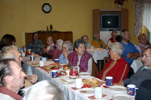 Allen schmeckten Plätzchen, Lebkuchen und Stollen. Punsch, Glühwein oder Tee wärmte von innen. Erst nachdem die „Atzenzeller Ari“ und „Als Maria übers Gebirge ging“ erklungen war, begaben sich die Seniorinnen und Senioren wieder auf ihre Zimmer.