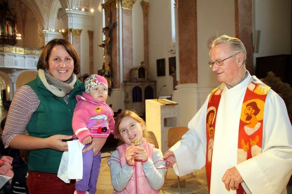 Zunächst traf man sich mit sechs Familien, die der Einladung gefolgt sind, zu einer ungezwungenen Andacht in der Pfarrkirche St. Jakobus, wo eine Andacht mit dem Lied „Wir feiern heut ein Fest“ begann, das Inge Rogenhofer auf der Gitarre begleitete. Pfarrer Pater Hermann Sturm betonte gegenüber den Eltern: „Kinder sind eine Bereicherung, geben dem Leben einen ganz anderen Sinn, fordern Opfer, bereiten aber auch viel Freude.“