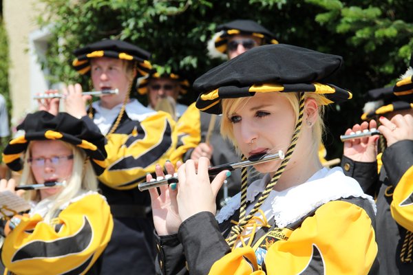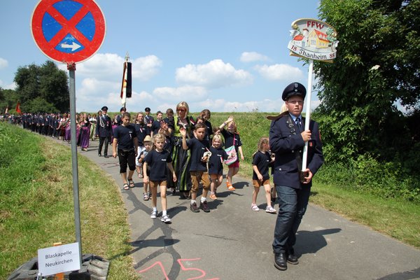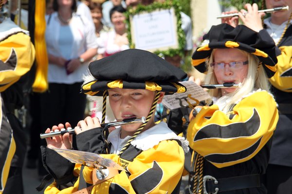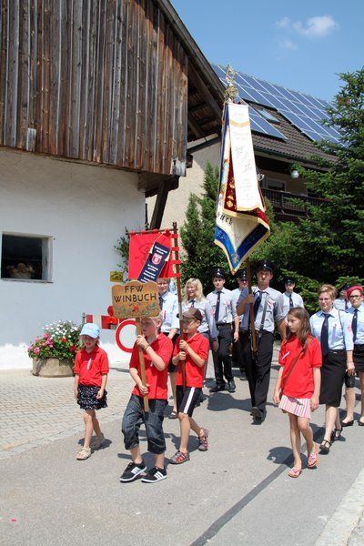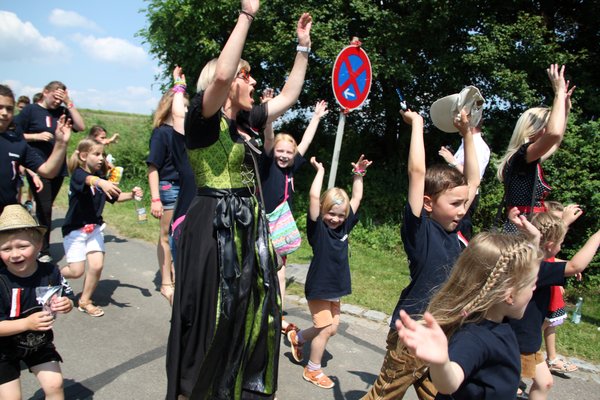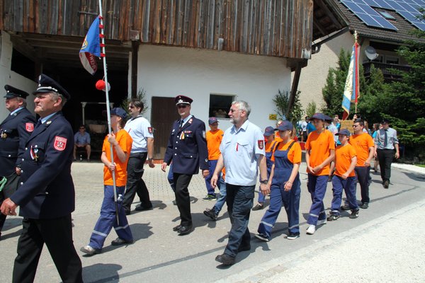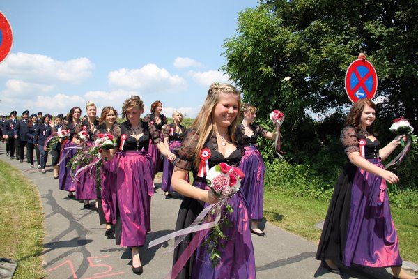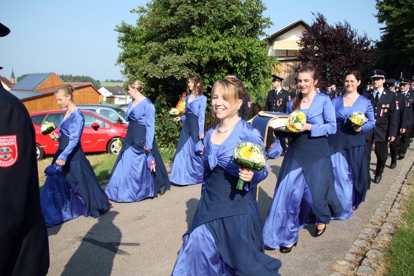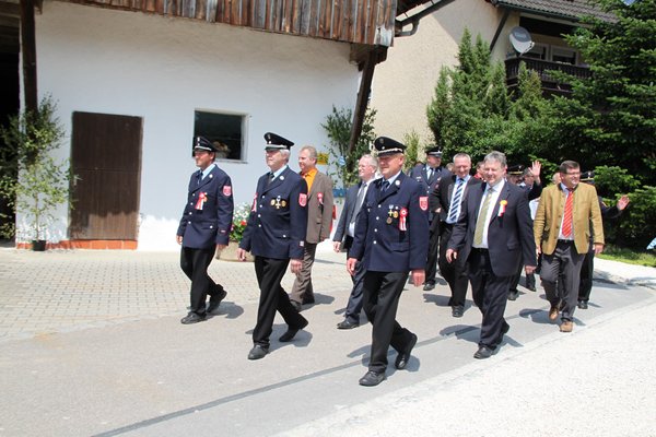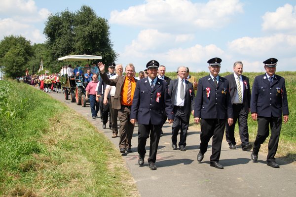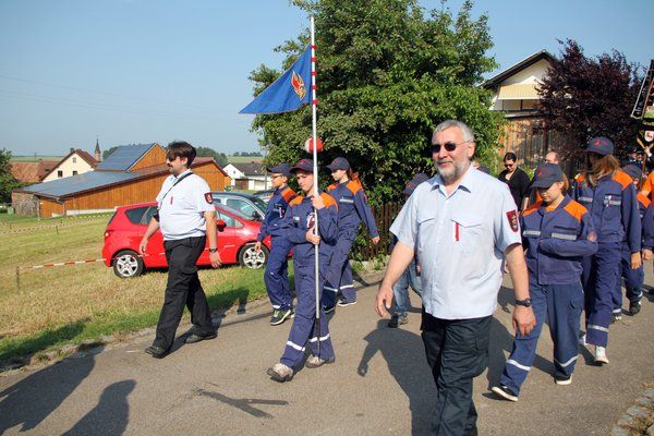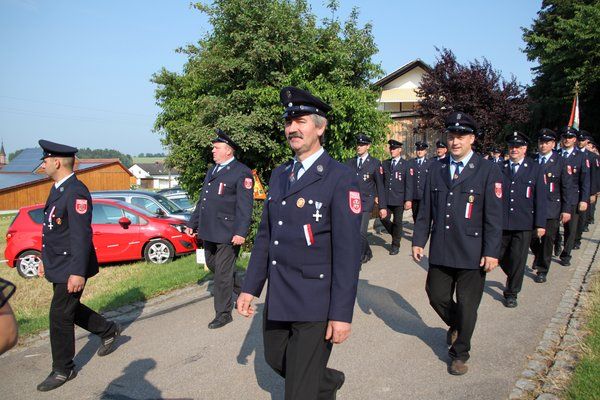 Bei strahlendem Sonnenschein und hochsommerlichen Temperaturen zog der kilometerlage Zug zu den Klängen von sieben Blaskapellen, 51 Feuerwehren aus den Landkreisen Amberg-Sulzbach und Schwandorf sowie der Stadt Amberg, ja sogar aus Hof und der Jugendfeuerwehr aus Ensdorf an der Saar, außerdem 16 Vereinen aus der Umgebung mit ihren bunten Fahnen durch die Straßen. Eine wahrhaft schweißtreibende Angelegenheit. Angeführt von der Festleitung, Schirmherr Landrat Richard Reisinger und den Ehrenschirmherren Pfarrer Pater Hermann Sturm und Bürgermeister Markus Dolacker sowie Ehrengästen wie KBR Fredi Weiß, MdL Reinhold Strobl, Bezirksrat Bürgermeister Peter Braun und CSU-Kreisvorsitzendem Dr. Harald Schwartz folgten auf einem Bulldog gezogenen Festwagen weitere Ehrengäste. Dann gab die Blaskapelle St. Ägidius Schmidmühlen den Ton an. Die Blaskapellen Neukirchen, Hohenburg, Dietldorf, Bubach, die Jugendblaskapelle Rieden und die Amberger Stadtpfeifer sorgten weiterhin mit klingendem Spiel dafür, dass die vielen teilnehmenden Vereine nicht aus dem Tritt kamen. Viele Schaulustige säumten den Weg und applaudierten.