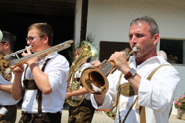 Zu den Klängen des Bayerischen Defiliermarschen zogen die Fahnenabordnungen ins Festzelt, wo es dann endlich kühle und nasse Labsal gab und die Blaskapelle St. Ägidius zünftig aufspielte und für tolle Stimmung sorgte.