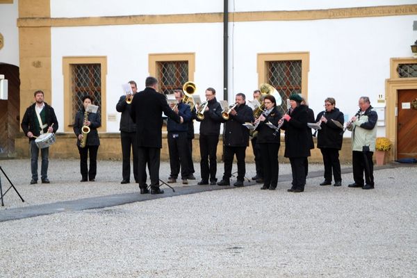 Bevor Bürgermeister Markus Dollacker seine Gedenkansprache zum Volkstrauertag hielt, spielte die Blaskapelle „Über den Sternen“. „Heute vor 100 Jahren wären wir mitten im Ersten Weltkrieg, vor 75 Jahren im Zweiten. Gerade 70 Jahre Friedenszeit in unserer Heimat“, erinnerte Bürgermeister Markus Dollacker. „Wenn wir uns heute daran erinnern, dann auch, weil wir aus unserer Vergangenheit lernen wollen. Geschichte liefert uns keine Anleitung, wie wir es besser machen!